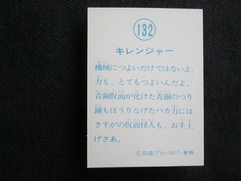 秘密戦隊ゴレンジャー ミニカード 70年代 バラ売り ・メーカー:山勝 ・1975年頃、当時の放送時に販売 ・6.6 cm x 5.0 cm ・同梱発送可能(複数落札の場合:定形、定形外郵便は、送料が変わる場合があります。) ・1-288番シリーズ ・1弾80種 001-080(タイトル違い.55.57.59.61.71.76.77,表修正.73) ・2弾32種 081-112 ・3弾64種 113-176 ・4弾48種 177-224 ・5弾32種 225-256 ・6弾32種 257-288 〓参考項目〓 ・原作石森章太郎 ・脚本上原正三 他 ・監督竹本弘一 他 ・制作テレビ朝日 ・放送期間1975年4月- 1977年3月 ・全84話 〓出演〓 ・海城剛・アカレンジャー:誠直也 ・新命明・アオレンジャー:宮内洋 ・大岩大太・キレンジャー:畠山麦 ・熊野大五郎・2代目キレンジャー:だるま二郎 ・ペギー松山・モモレンジャー:小牧りさ ・明日香健二・ミドレンジャー:伊藤幸雄 ・江戸川総司令:高原駿雄 ・陽子・007:鹿沼えり ・黒十字軍総統:安藤三男、八名信夫 ・ナレーション:田中信夫、大平透