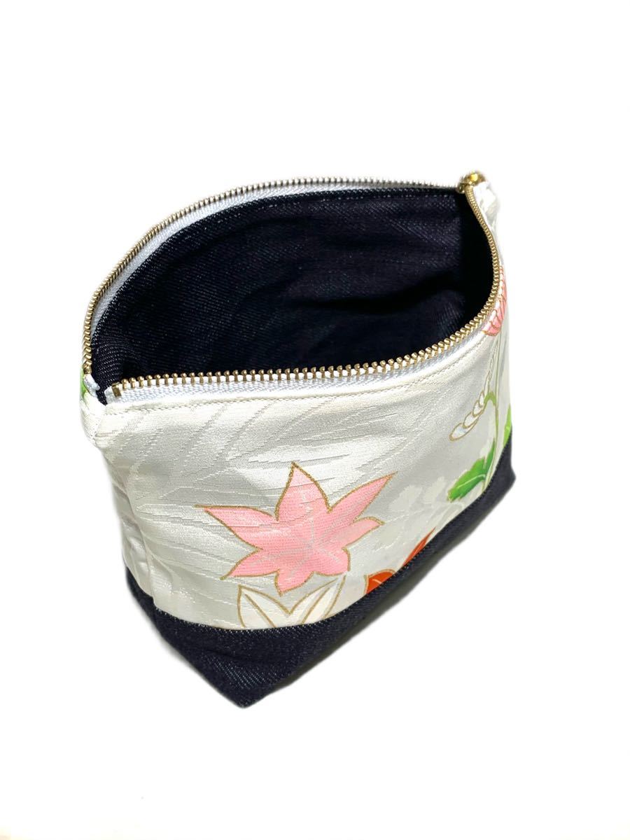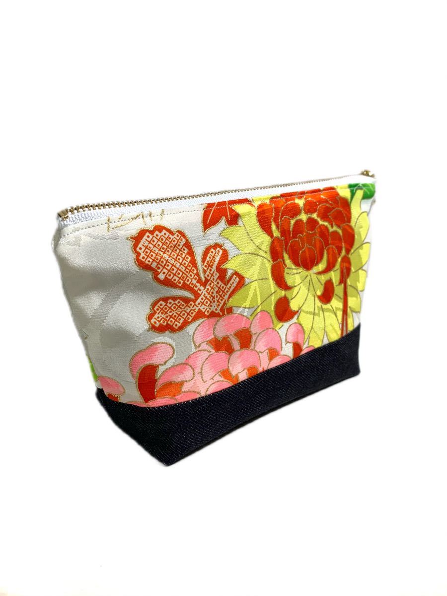 鮮やかな花柄に細かな金箔が付いた高級和柄着物をリメイク、岡山県産児島デニムを組み合わせた和洋デザインポーチになります!