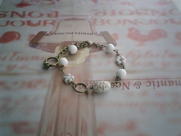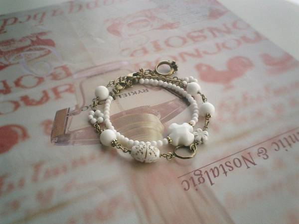 アート・ロマン主義・・シリーズです♪ベネチアに恋して・・やさしい白でまとめたブレスレット2点セットです♪お揃いで着けても単品でも楽しんでいただけます♪♪どちらもオフ・ホワイトでまとめてふんわりやさしい表情です♪シンプルなデザインは3ミリのホワイト・ジェードの丸玉に15ミリのクロスカットのホワイトオニキスを合わせました♪長さは16センチ+アジャスター6センチで最長22センチ位です♪8ミリの丸玉の樹脂ビーズにはチェコのデザインビーズやベネチアンビーズやメタルリングを合わせてひっそり可憐な表情です♪長さは全長23センチ位で調節自由です♪♪それぞれ単品やお揃いのネックレスも出品しています♪シンプルで飽きのこないいつまでも着けられるデザインを考えて作りました!ハンドメイドをご理解頂いてノークレーム、ノーリターンでお願いします