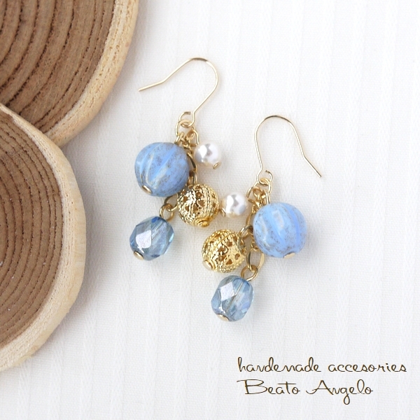 ◆+angelo+チェコメロンと透かし玉のピアス(p-019)エンジェルブルー G サックスブルー チタン 樹脂 イヤリング
