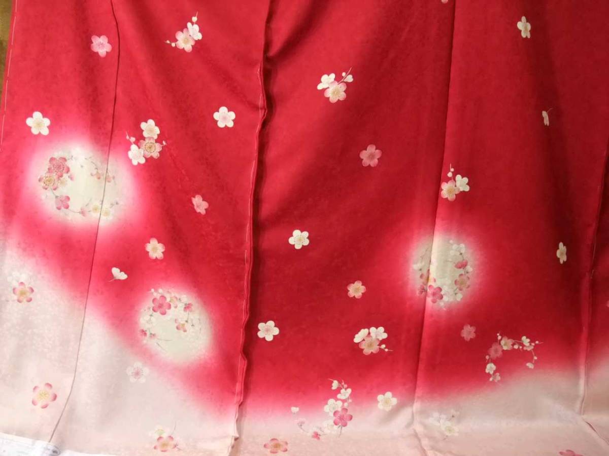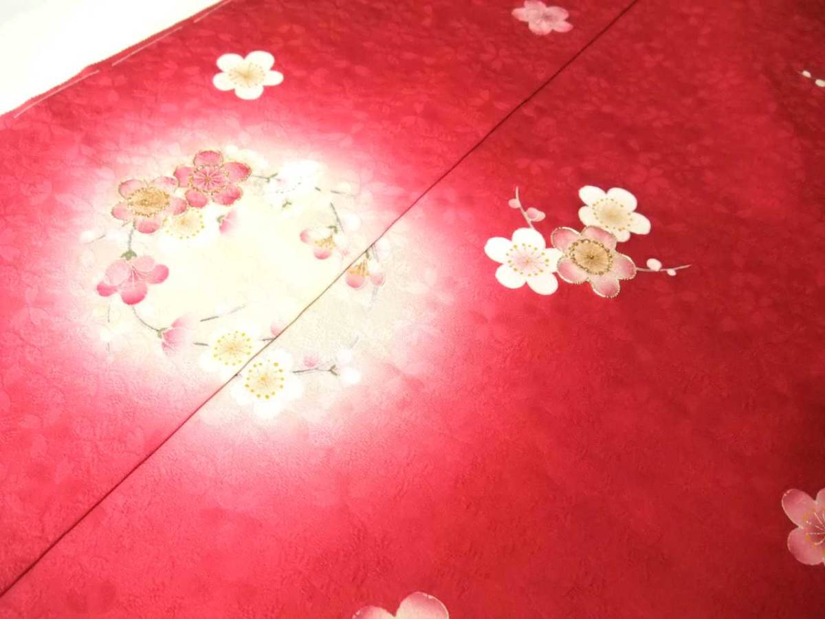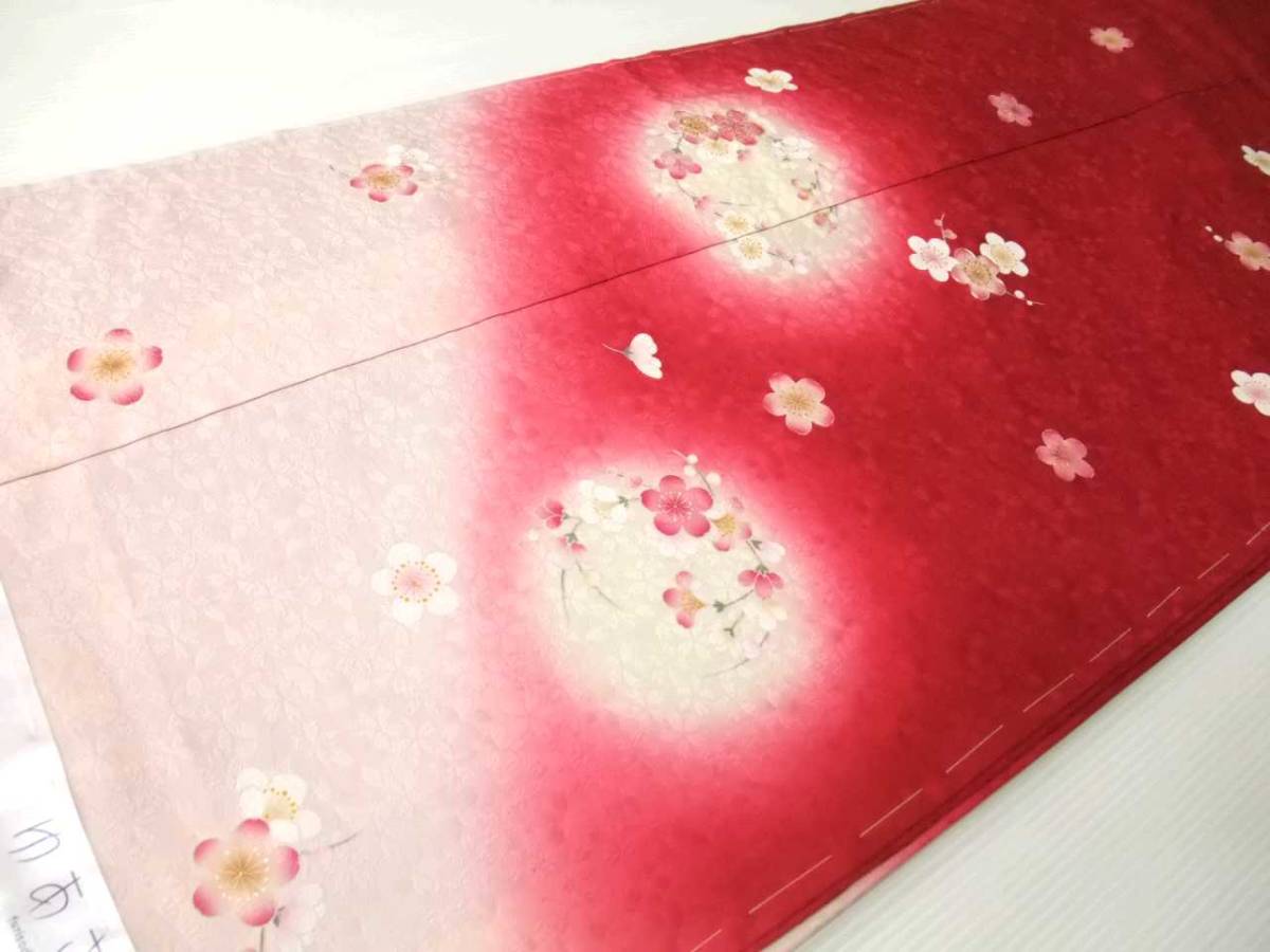 おしゃれな赤色地ぼかし梅花模様の新品正絹京友禅振袖生地です。