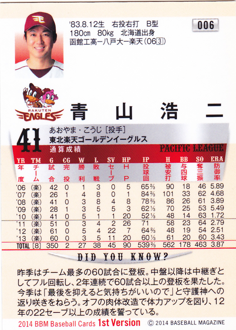 BBM2014ベースボールカード1st 006 青山浩二 北海道 函館工業高校 八戸大 東北楽天ゴールデンイーグルス