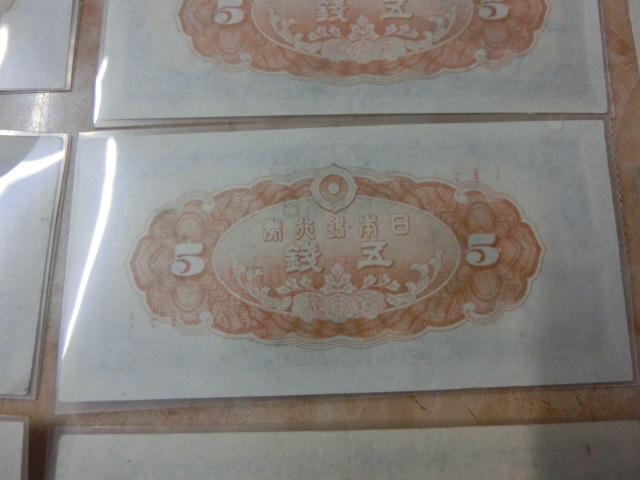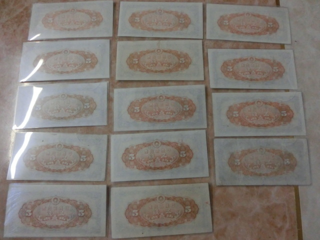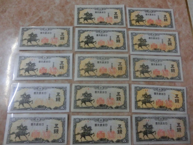 日本銀行券5銭 楠公5銭の組番号1~14番までの未使用~極美品を14枚です。(1枚並入り)