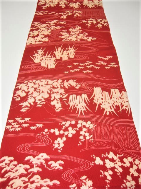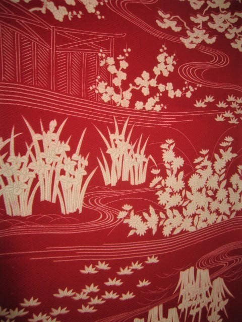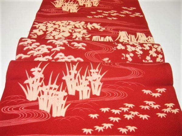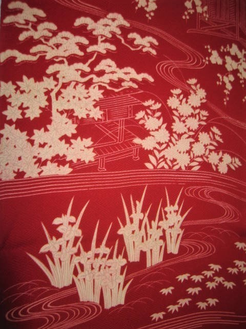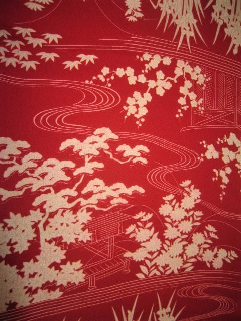 1-71★赤地*菖蒲*菊*松竹梅*綸子*古布はぎれ★アンティーク/一閑張り/文化人形/市松人形
