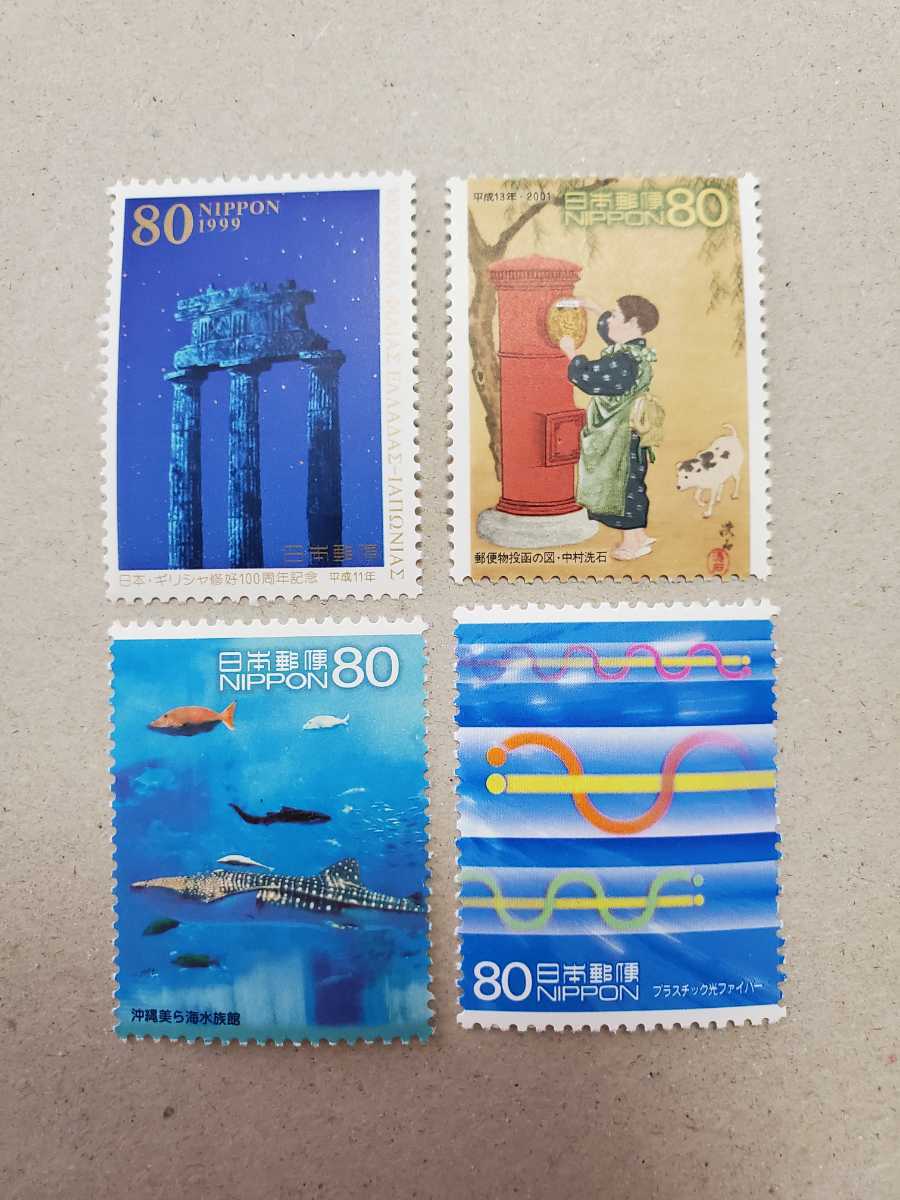 未使用 貴重 80円 切手 4枚 額面320円  日本・ギリシャ修好100周年記念 郵便物投函の図 沖縄美ら海水族館 プラスチック光ファイバー
