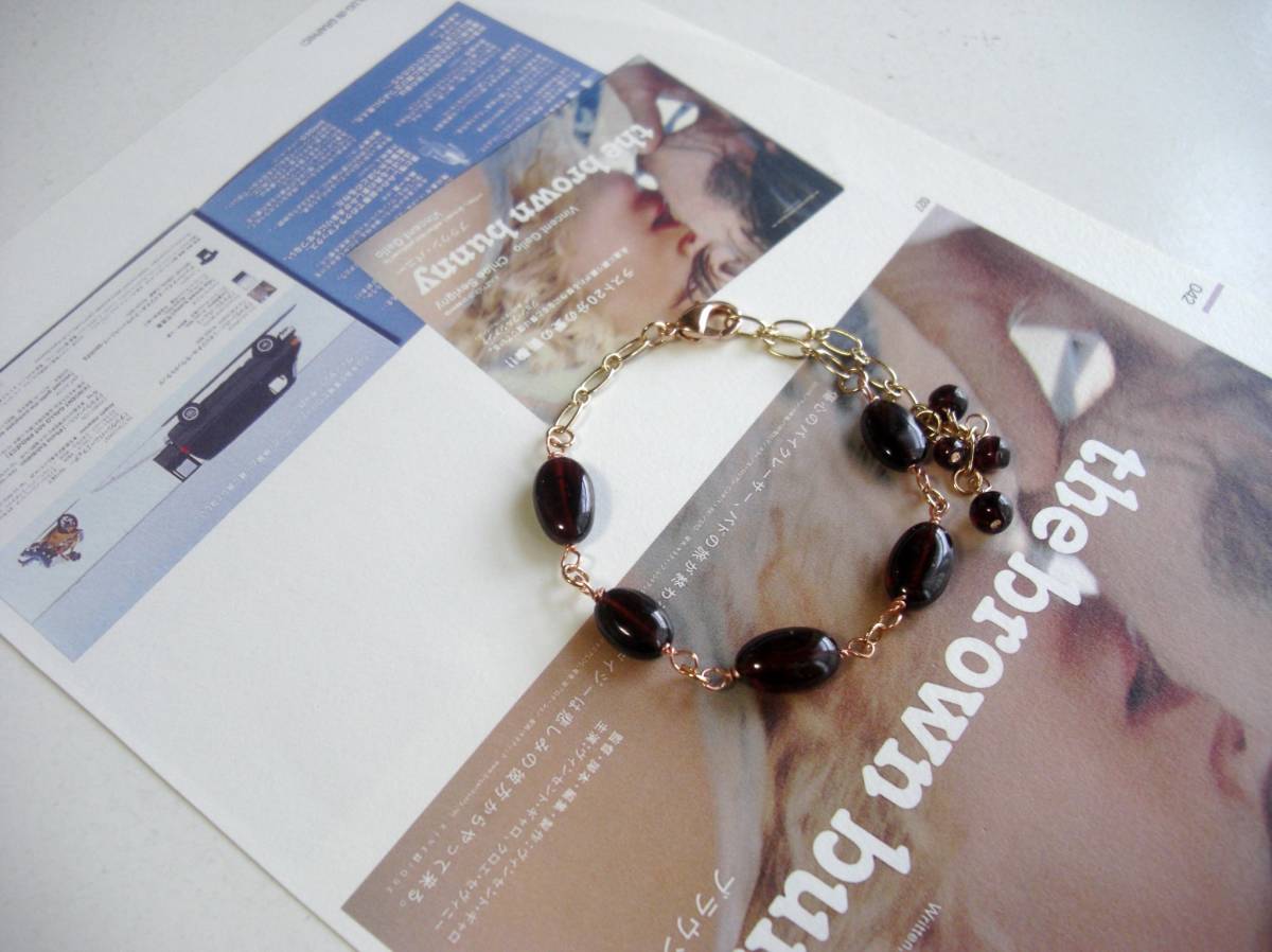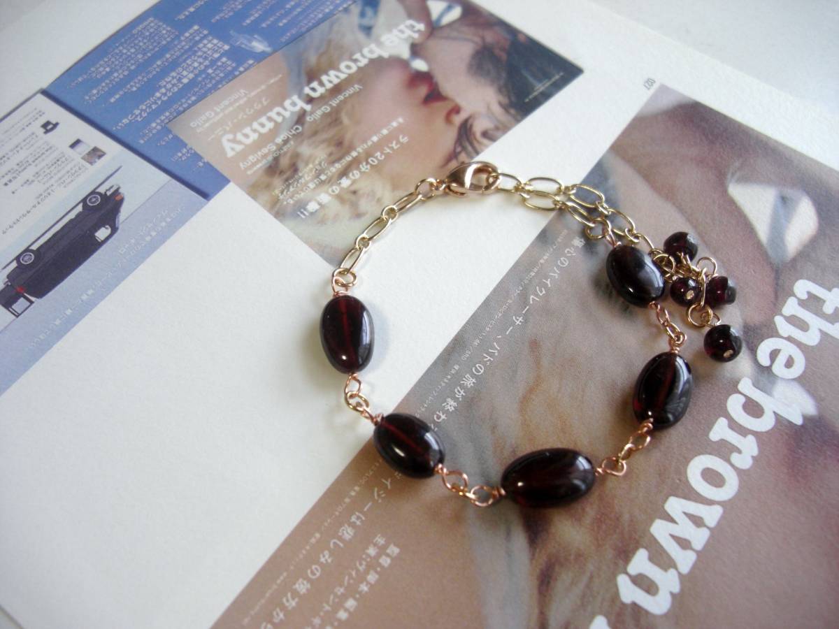 お揃いコーデ・・シリーズです♪ガーネット見本帖・・深い赤のガーネットのブレスレットです♪小粒のオーバルのガーネットにピンクゴールドのチェーンを合わせて可憐な表情です♪♪11ミリ×7ミリ位のオーバルのガーネットを繋いだブレスレットは全長22センチくらいで調節自由です♪ネックレス、イヤリングも出 品しています♪♪シンプルで飽きのこないいつまでも着けられるデザインを考えて作りました!ハン ドメイドをご理解頂いてノークレーム、ノーリター ンでお願いします