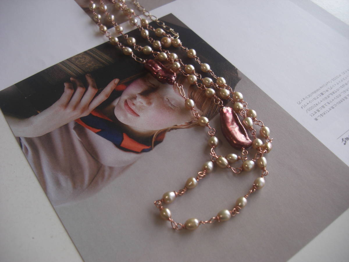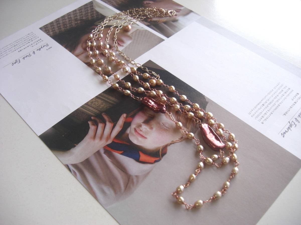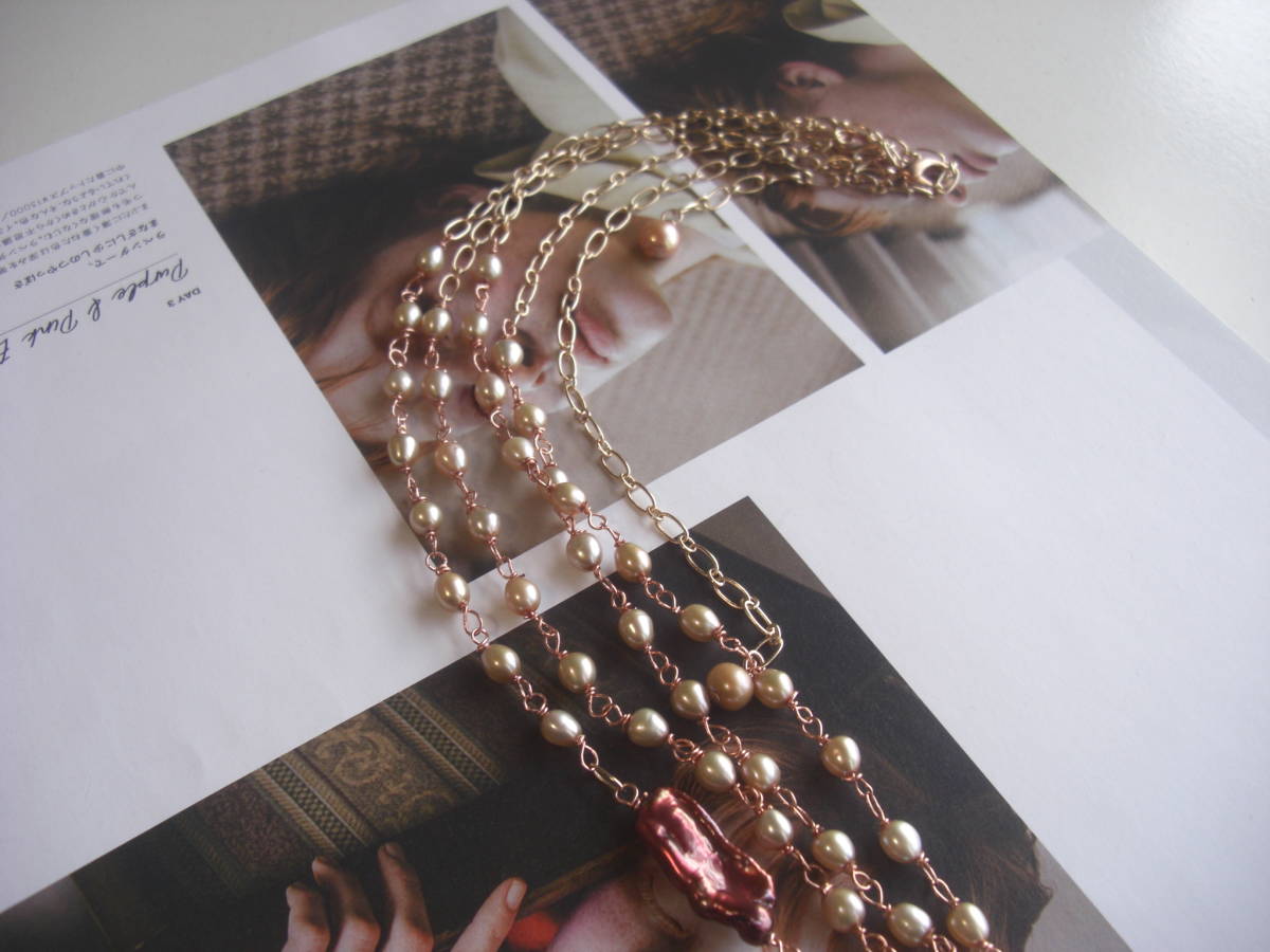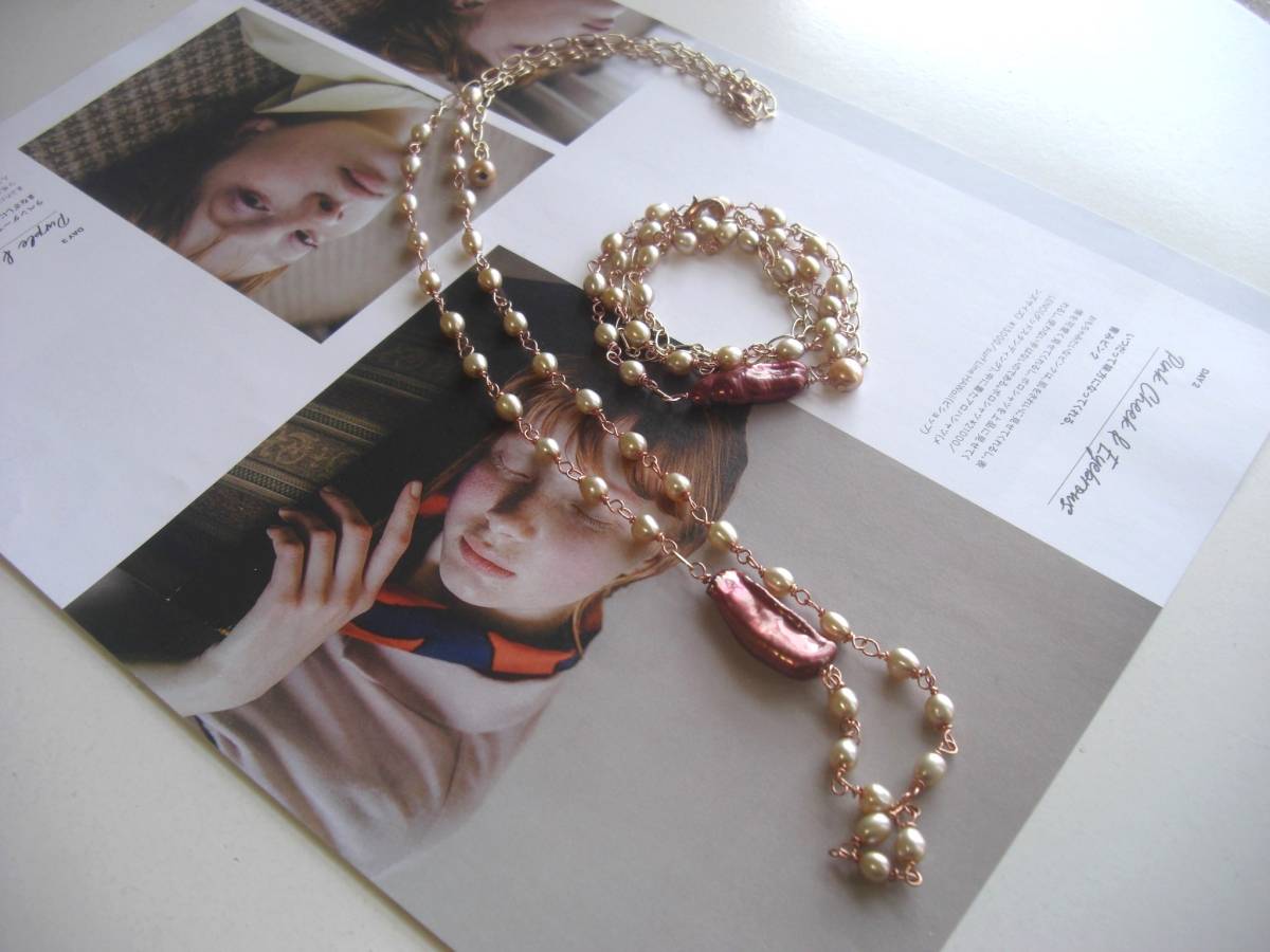 お揃いコーデ・・シリーズです♪やさしいピンクパールの一揃い・・やさしいピンクパールの淡水パールのネックレス2本セットです♪同じデザインの長さ違いです♪画像のようにネックレスで重ねたり1本をブレスにしたりそれぞれ単品にしたり色々に楽しんでいただけます♪5ミリ位のライス型の淡水パールにダークレッドのステック型の芥子パールを合わせました♪長い方のネックレスは長さ90センチ位で調節自由です♪短い方のネックレスの長さは全長74センチ位で調節自由です♪それぞれ単品でも出品しています♪シンプルで飽きのこないいつま でも着けられるデザインを考えて作りました!ハンドメイドをご理解頂いてノークレーム、ノーリターンでお願いします