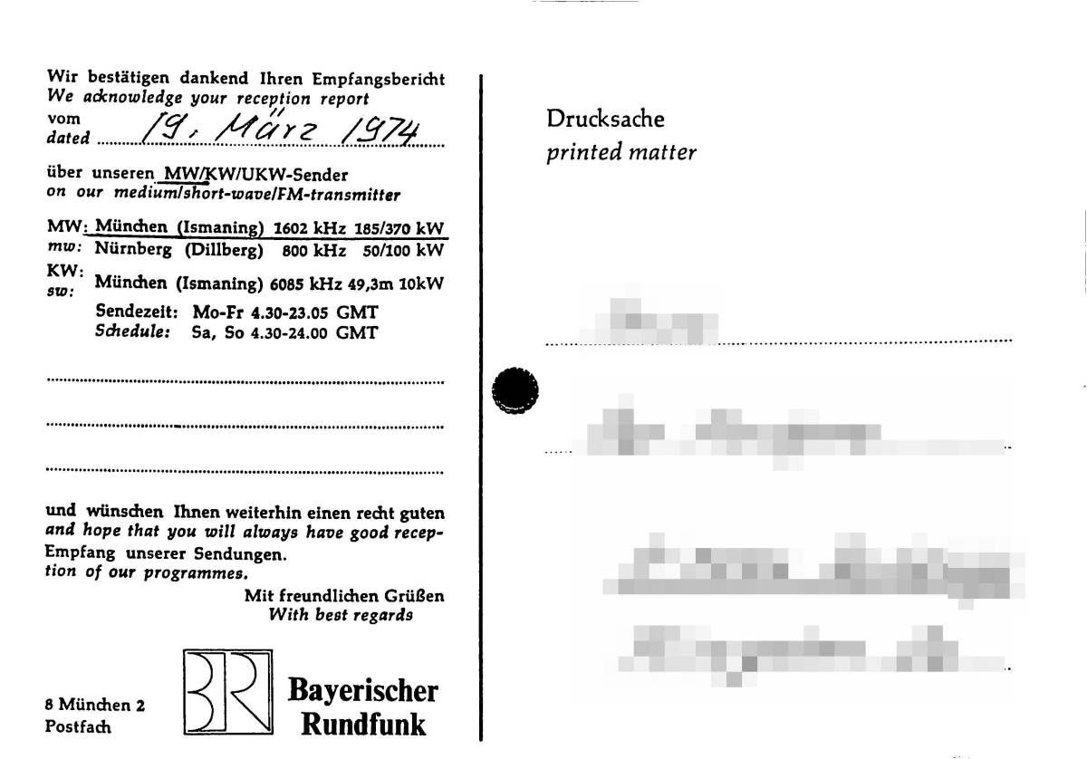 【商品名】・・・BAYERISCHER RUNDFUNK(★バイエルン放送)ベリカード。 【国名・地名】・・・ドイツ連邦共和国★ミュンヘン。 【受信データ】・・・1974年3月19日★MW1602KHZを受信。 【記載事項】・・・受信データ・受信者の住所・氏名が記載。 【状態】・・・シワ、汚れ、シミ、焼け、色あせ等があります。 ■カードの状態は★画像を参考に判断して下さい。 ■この機会にぜひこのベリカードを貴方のBCLコレクションに加えて下さい! | |