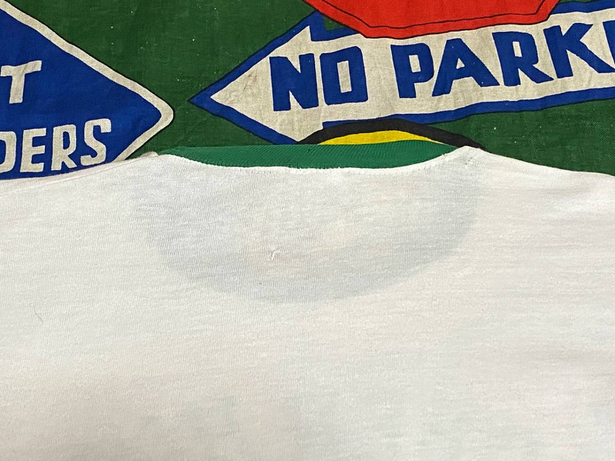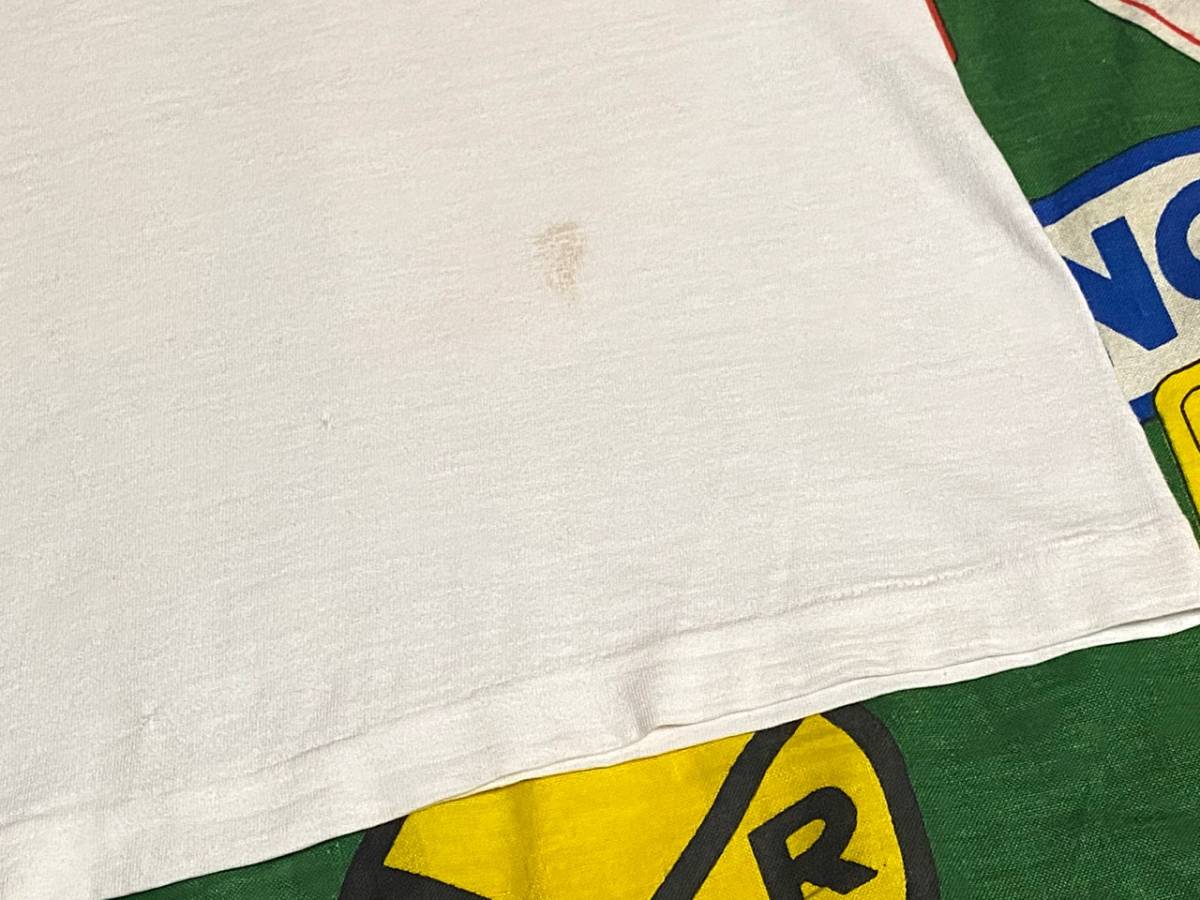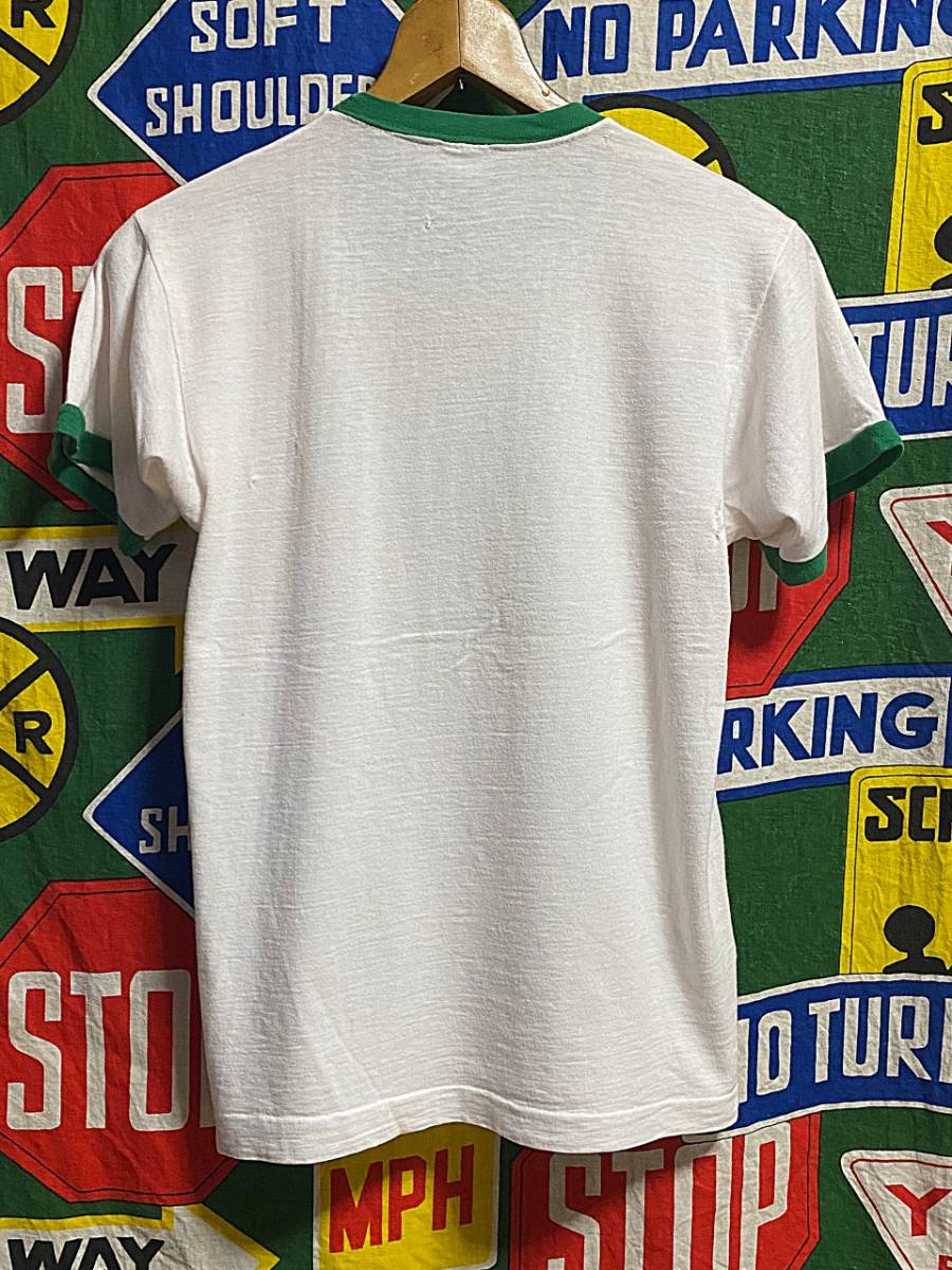 ボディーはコットン100%、ブルーバータグ(バータグ)搭載の1枚で、白ベースのボディーにプリントとトリムが鮮やかなグリーンという配色もカレッジ系の中では、なかなか珍しいビンテージTシャツです。