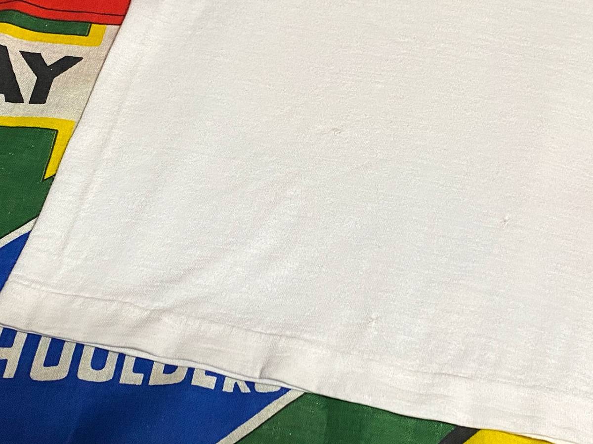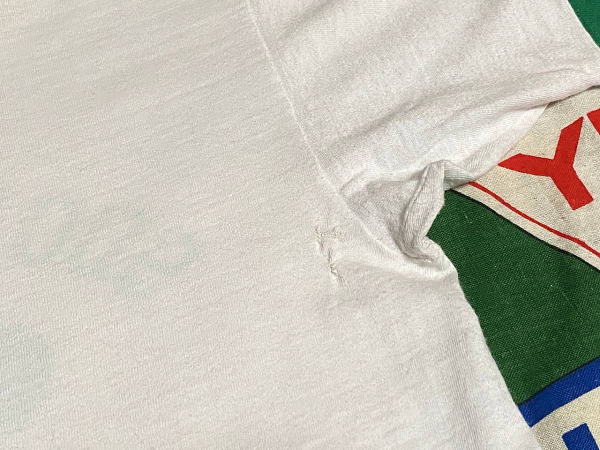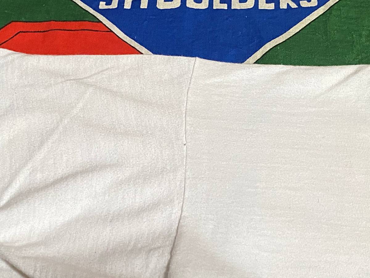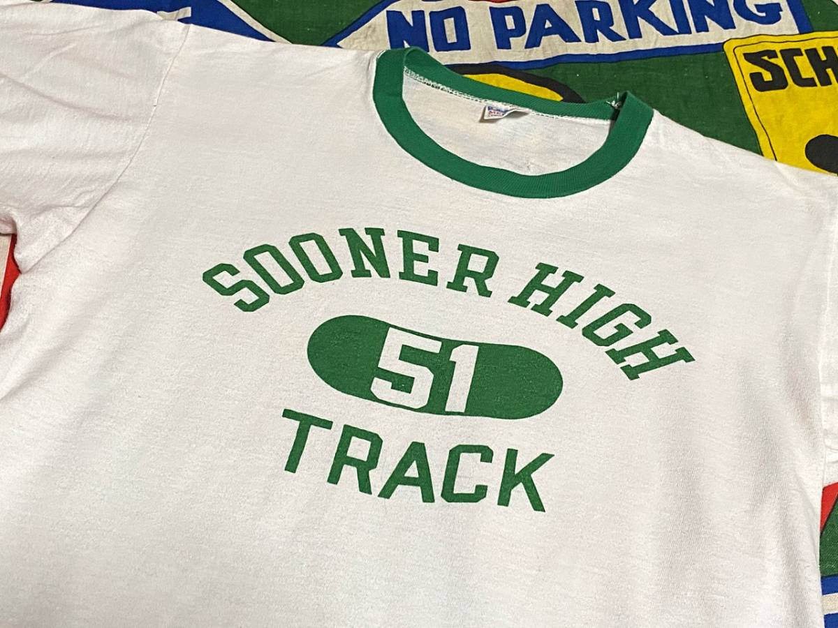 ボディーはコットン100%、ブルーバータグ(バータグ)搭載の1枚で、白ベースのボディーにプリントとトリムが鮮やかなグリーンという配色もカレッジ系の中では、なかなか珍しいビンテージTシャツです。
