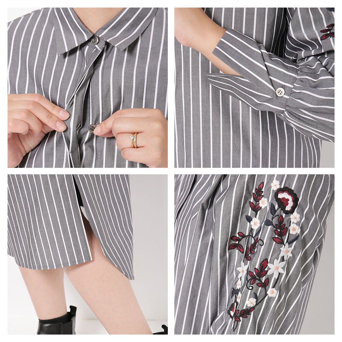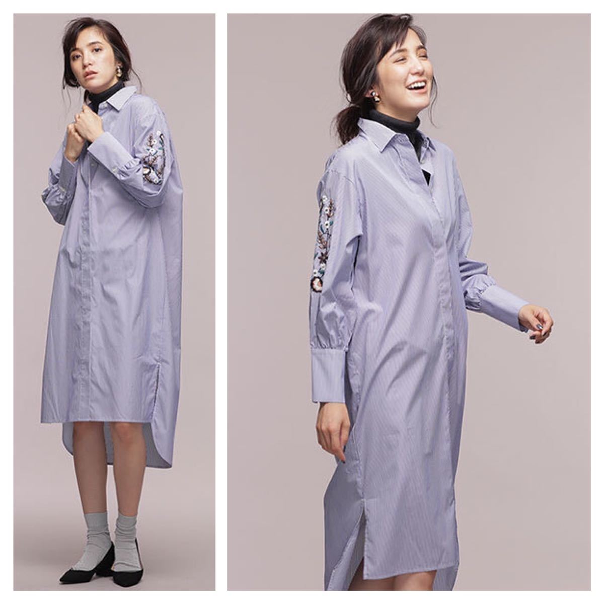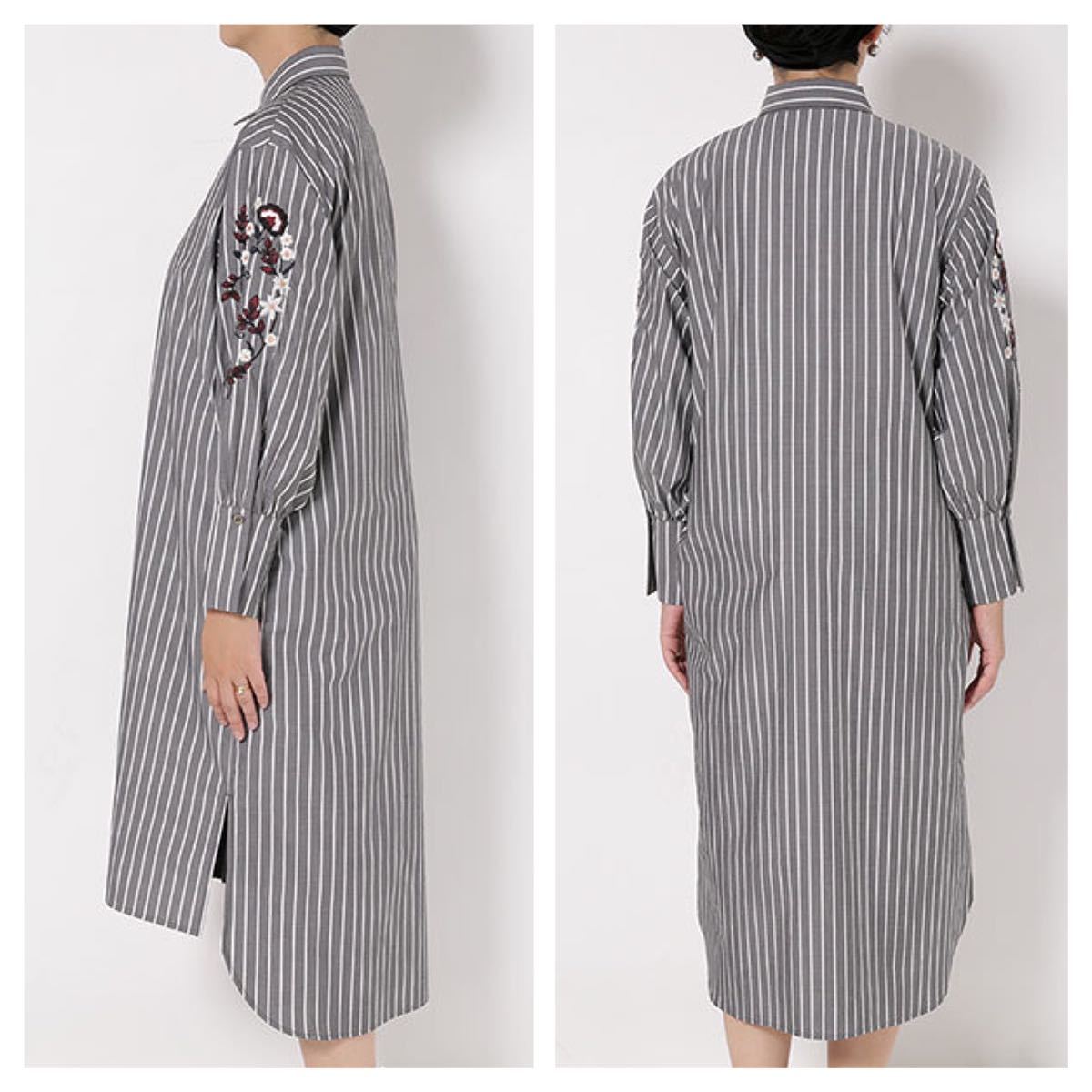 袖に施したフラワー刺繍デザインがポイントのシャツワンピース。無地・太ストライプ・細ストライプの生地に、それぞれ異なる刺繍カラーを合わせました。