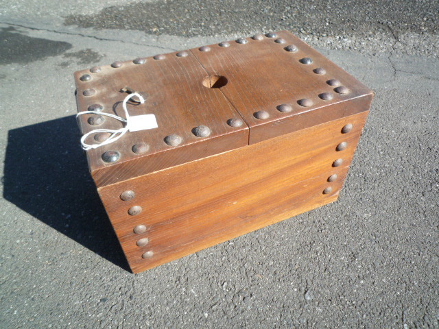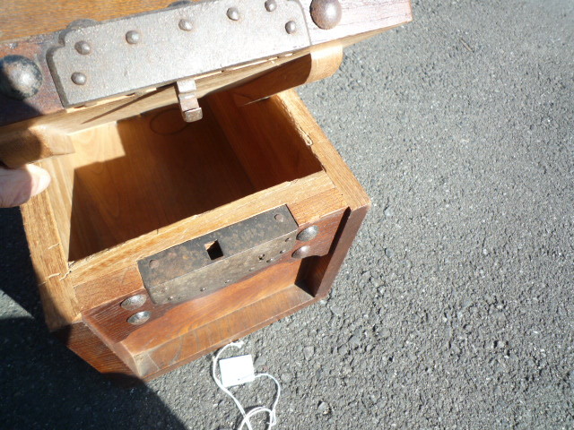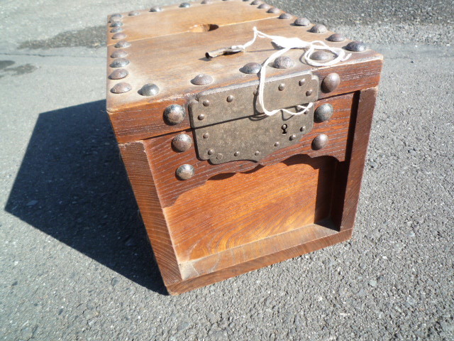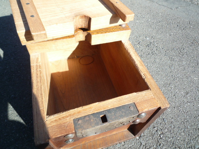 銭箱です。錠前内蔵方で鍵もあります。サイズは37x23x23cmです。素材は欅材です。