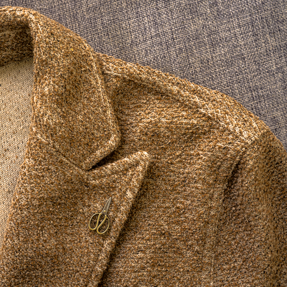 フラワーラペルにはテーラーを連想させるハサミモチーフのピンが施されています。日本ではまだ取扱いの少ないブランドながら本国イタリアでは老舗として広く知られた存在です。