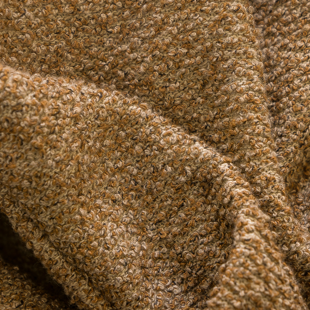 素材はリネン、コットン、ポリエステルの3者混紡素材を使用。カールしたリングの糸を使用し、立体感ある生地の奥行きを出し、味わい深い表情に仕上げているのがポイントです。ざっくりとしたニット織りの立体感のある表情がモダンさに加えて、落ち着きのある大人の色気を演出します。