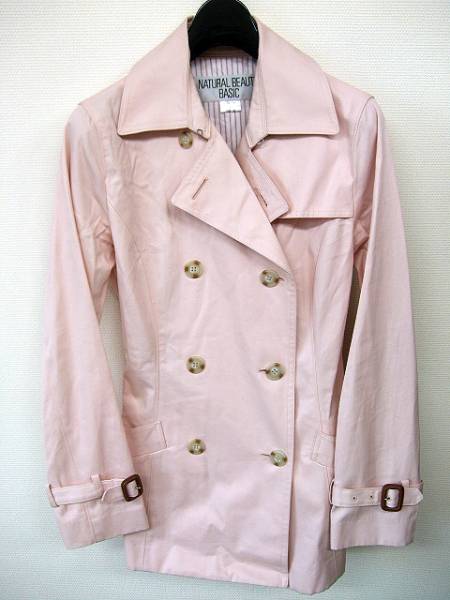 NATURAL BEAUTY BASIC 薄手のトレンチコートです。色は薄いピンク。素材はコットンです。裏地は一部に付いてますが殆ど一枚地です。スッキリ着れます!◆サイズはSで着丈約66cm・肩幅約36cm・袖丈約57cm・身幅約41.5cmです。◆USEDですが状態は良好です。◆