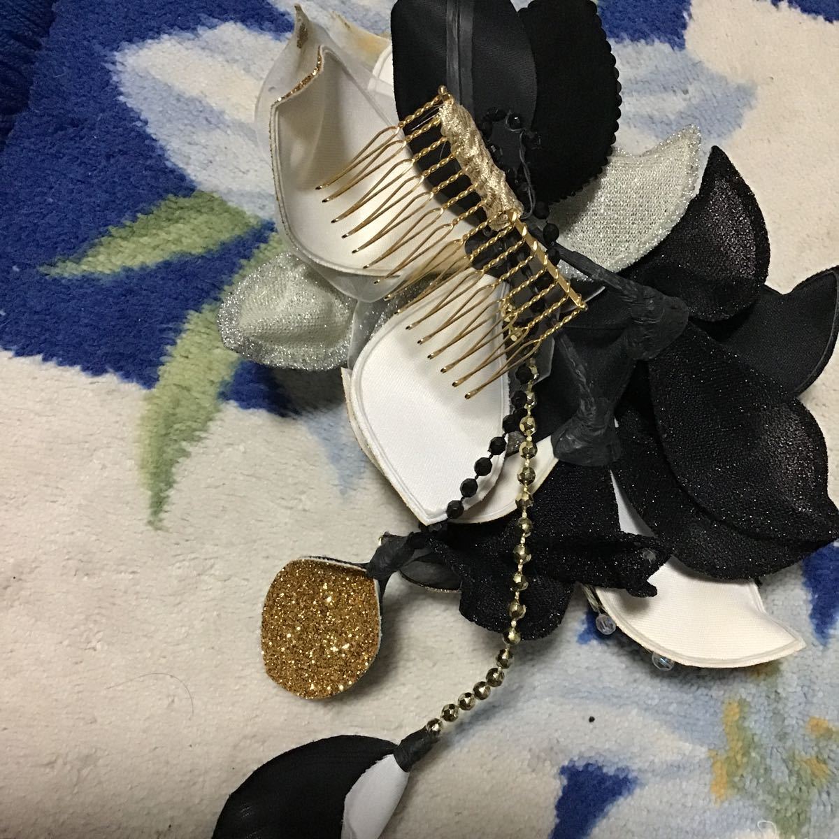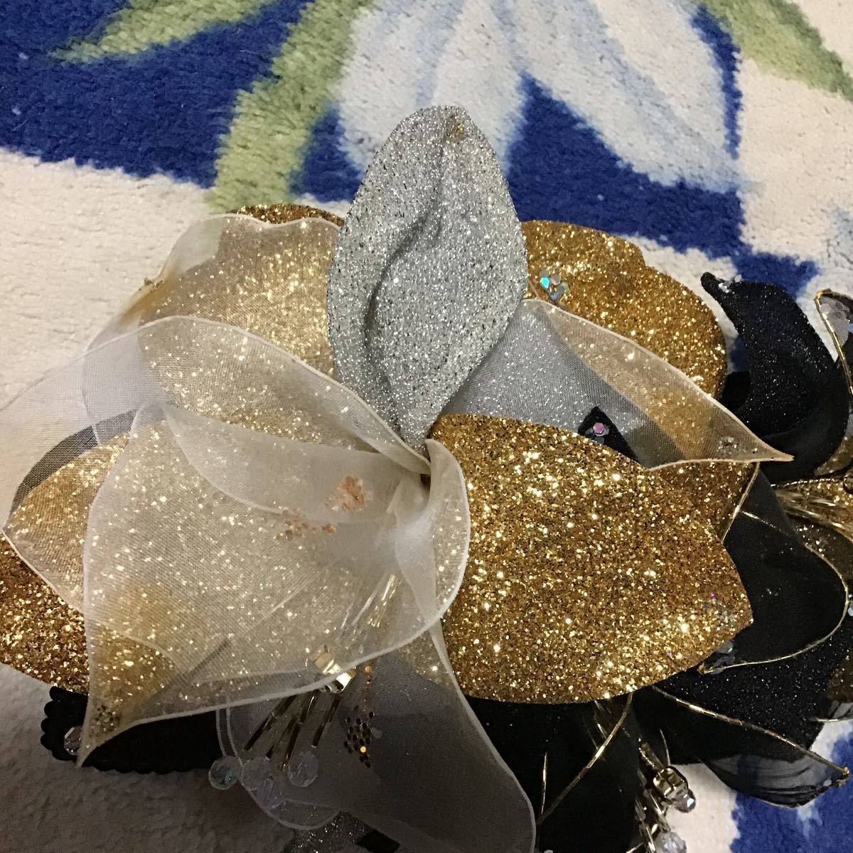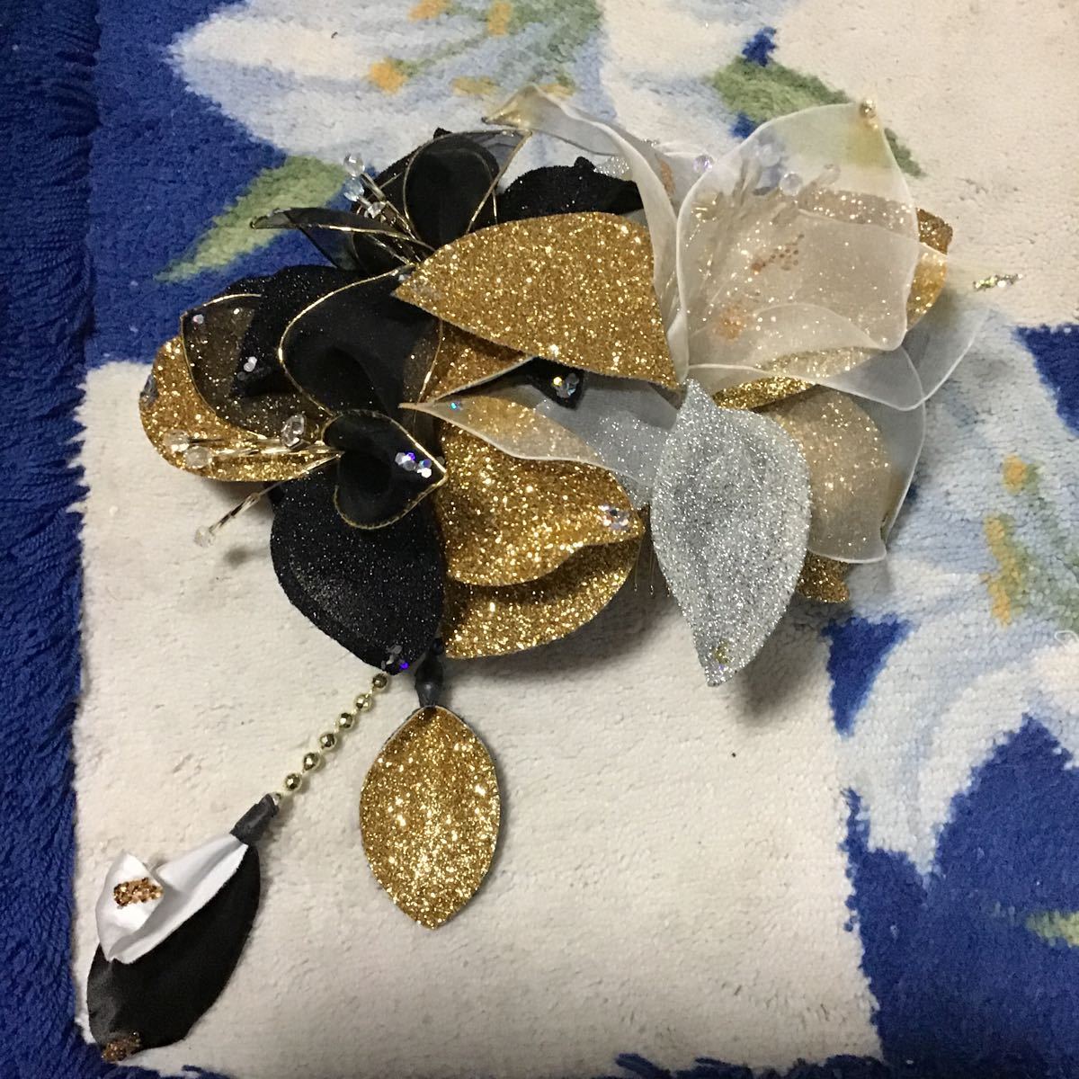 大小3つの大ぶりのお花が、ゴールドやシルバーや、ごくわずかに極々薄いベージュがかったオフホワイトと黒のオーガンジー生地などと、ゴージャスに組み合わせられています♪