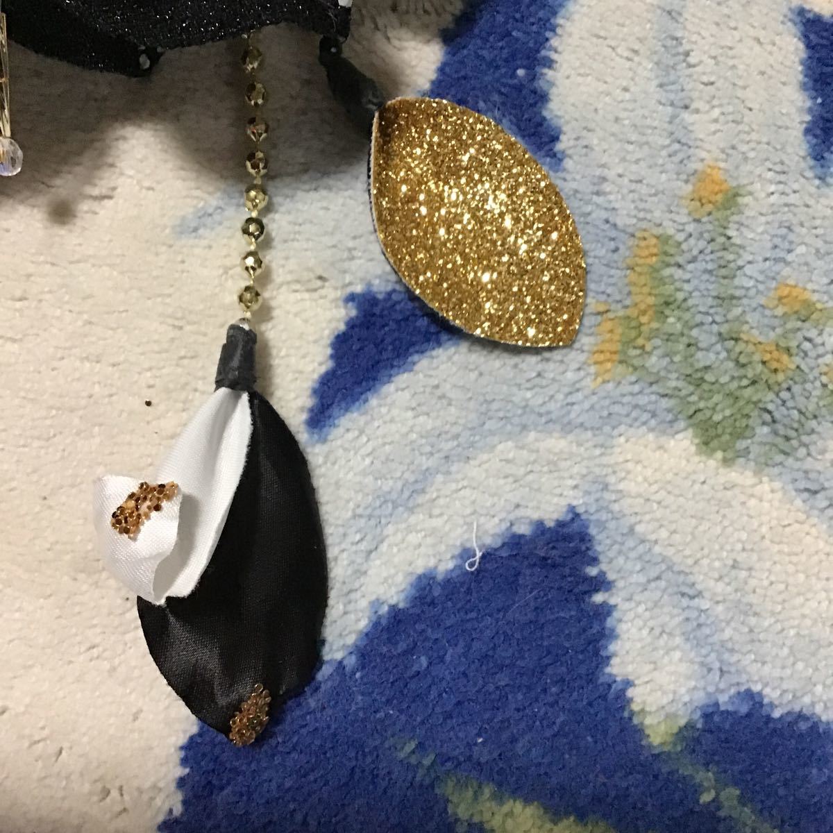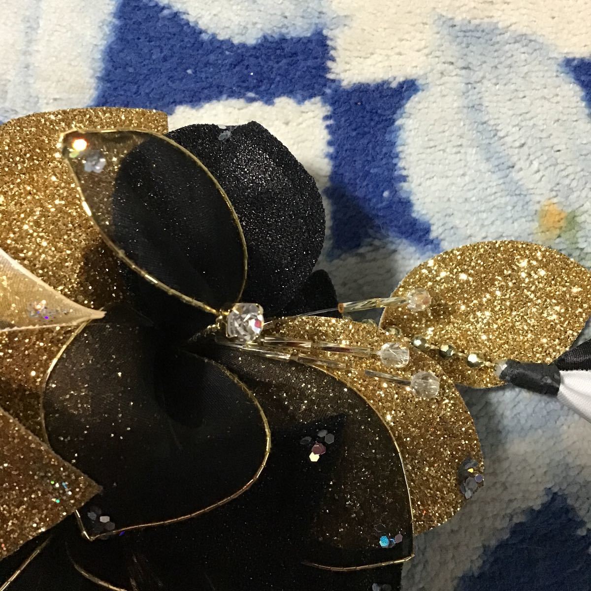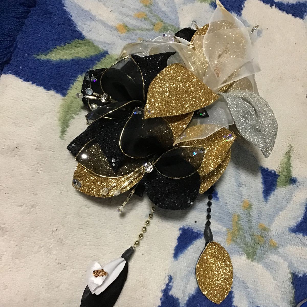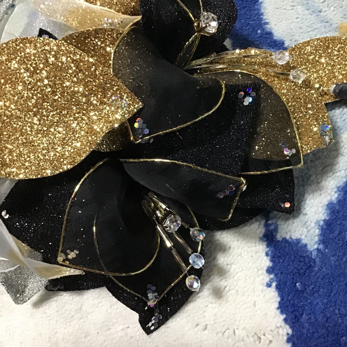 大小3つの大ぶりのお花が、ゴールドやシルバーや、ごくわずかに極々薄いベージュがかったオフホワイトと黒のオーガンジー生地などと、ゴージャスに組み合わせられています♪