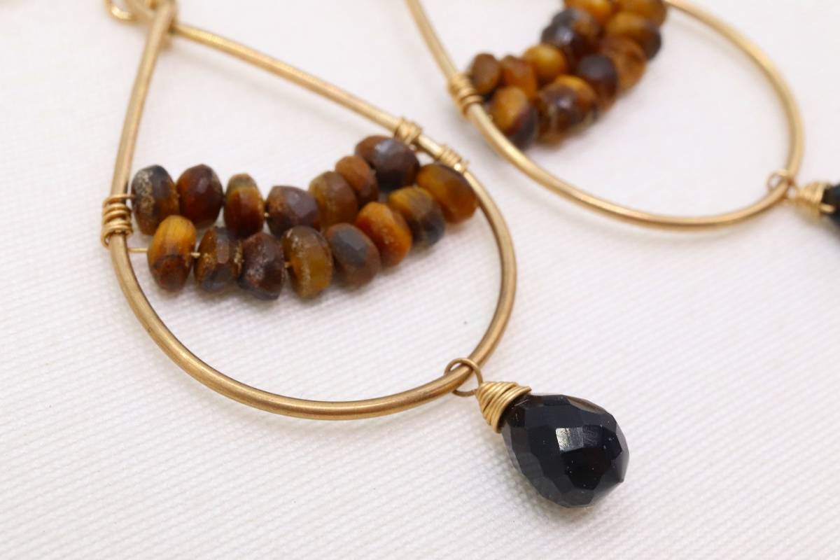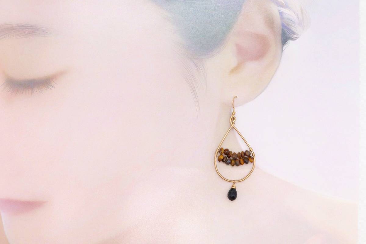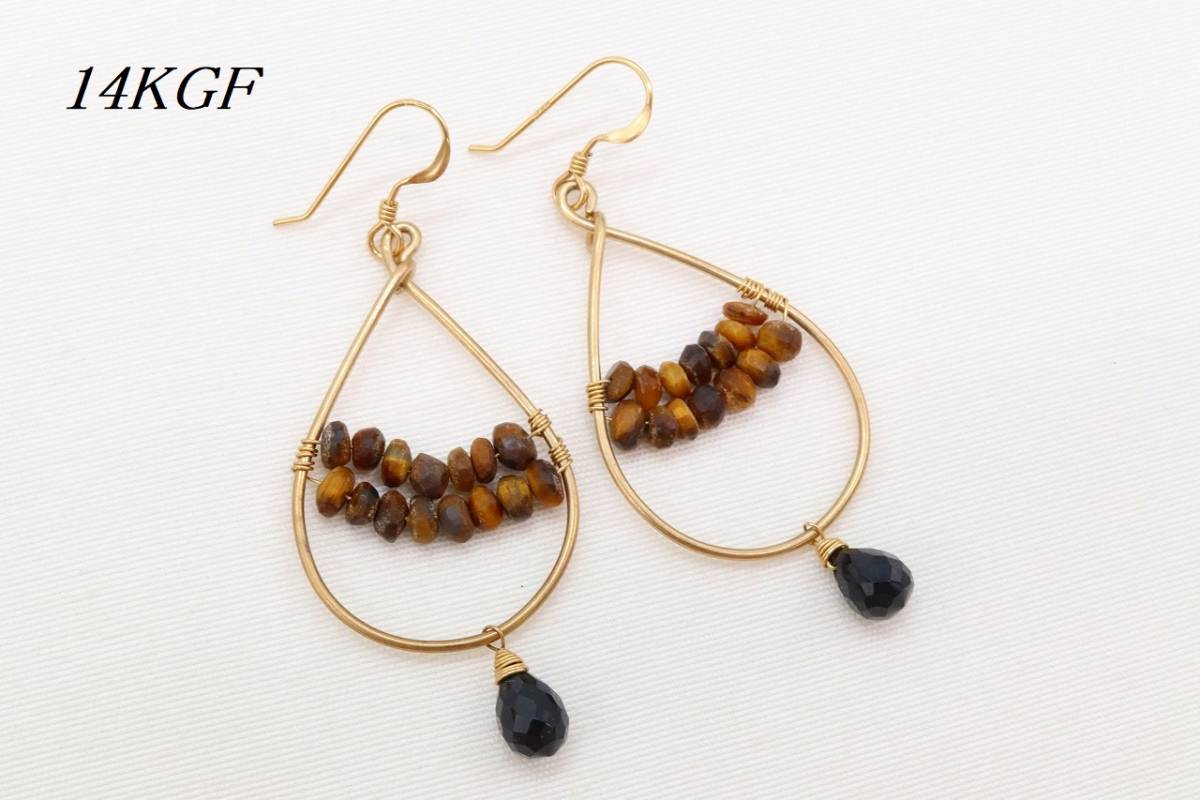 ■ 【X146】14KGF タイガーアイ ブラックスピネル 変形 フープ ピアス フック ティアドロップ 揺れる 天然石【送料全国一律198円】