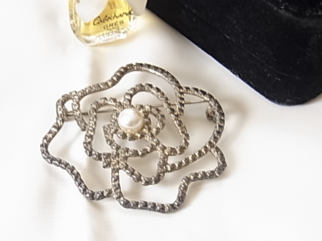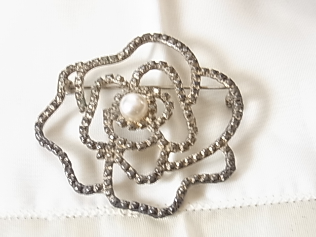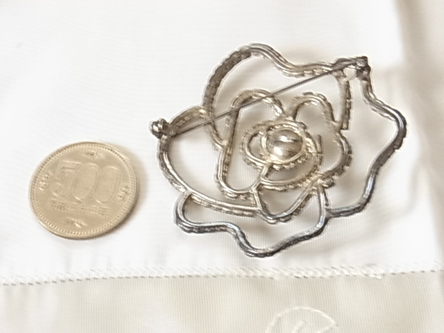 インパクト感 お花のモチーフ バラ 薔薇 ローズのような形状にパール調ビジュー付き ヴィンテージ/ビンテージ ブローチ◇