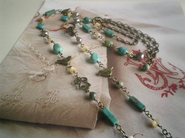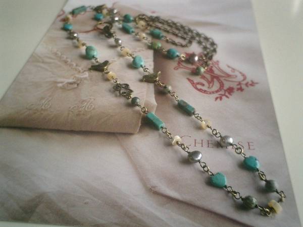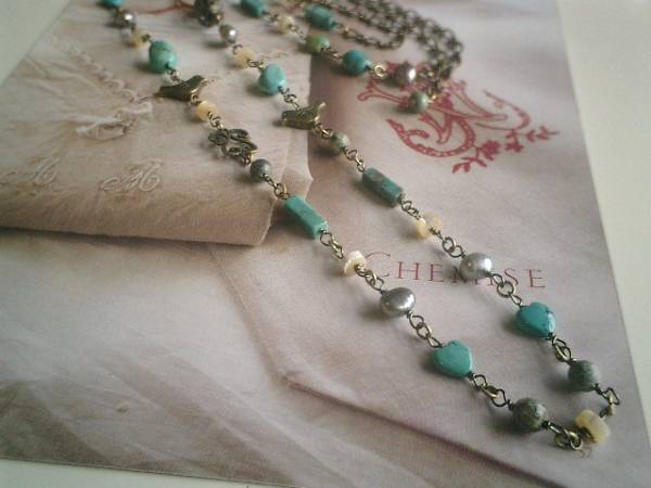秋の小鳥さん・・シリーズです♪ノスタルジック・パリ・・シックなターコイズのネックレスです♪6ミリから16ミリ位までの丸玉、ハート、スクエア、タンブルなどデザイン違いのターコイズにグレーパープルの淡水パールやマザーオブパールや透かしや小鳥さんのデザインチャームを合わせてアンニュイな表情です♪長さは全長105センチ位で調節自由です♪2連にされても素敵です♪♪シンプルで飽きのこないいつまでも着けられるデザインを考えて作りました!お揃いのブレスレットも出品しています♪ハンドメイドをご理解頂いてノークレーム、ノーリターンでお願いします