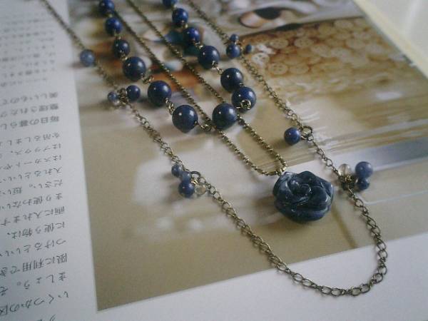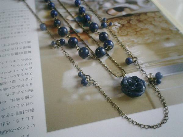 素敵・マニア・・シリーズです♪藍色の薔薇・・深い藍色の石や薔薇を集めたネックレス3点セットです♪単品や2本、3本セットと色々な組み合わせで楽しんでいただけます♪シンプルなデザインはラピスの6ミリ、8ミリ、10ミリの丸玉のグラデーションのネックレスです♪長さは全長75センチ位で調節自由です♪18ミリ位のソーダライトの薔薇にはデザインボールチェーンを合わせました♪長さは68センチ+アジャスター12センチで全長80センチ位です♪華奢なチェーンには4ミリ、6ミリのデニムラピスや4ミリのスモーキークォーツの丸玉を散らして可憐な表情です♪長さは全長110センチ位で調節自由です♪2連にされても素敵です♪それぞれ単品やブレスレットやピアスも出品しています♪シンプルで飽きのこないいつまでも着けられるデザインを考えて作りました♪ハンドメイドをご理解頂いてノークレーム、ノーリターンでお願いします