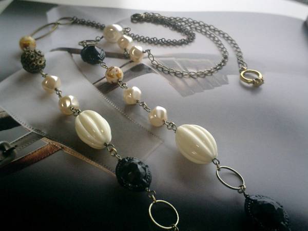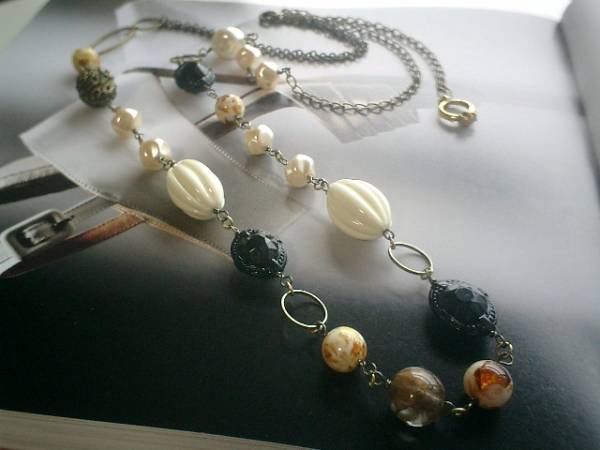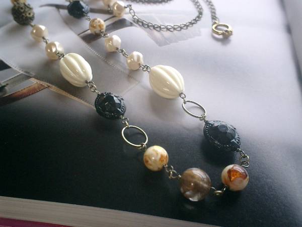 エスニック・気分・・シリーズです♪シックな異素材を集めたネックレスです♪8ミリから22ミリ位までのデザイン樹脂ビーズやドイツビーズやチェコビーズに10ミリ位の琥珀の丸玉を添えてエスニックな表情です♪長さは全長92センチ位で調節自由です♪2連にされても素敵です♪お揃いのネックレスやブレスレットも出品しています♪シンプルで飽きのこないいつまでも着けられるデザインを考えて作りました!ハンドメイドをご理解頂いてノークレーム、ノーリターンでお願いします |