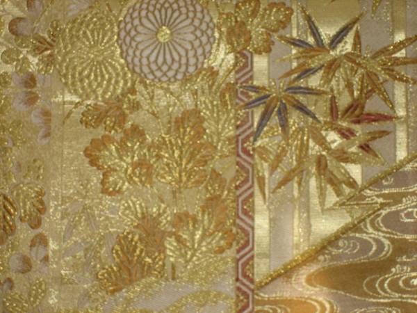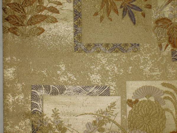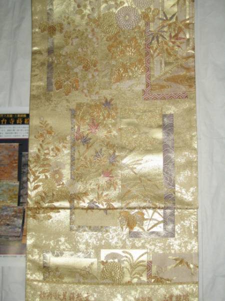 | 新品即決! 『高台寺蒔絵 短冊秋草蒔絵文(パンフレットあり)』(壱千八百織(橋本清織物) 仕立てつき訪問着帯 西陣6通柄袋帯 金地(裏地くすみ薄金) 絹100%(新表示:絹80%指定外繊維(紙、金属糸風)20%) 新品み仕立て品ですがこのお値段で仕立てつきで、納品です。なお、最終日まで待っていただかなくとも、入札した時点でオークションは終了し落札者となります。お値段的にもお安く設定いたしましたお買い得品です(西陣帯です)。もちろん綿芯込みの仕立て付きですが、仕立てなしの場合でも金額は変わりません。 商品送付は落札後仕立てに出しますので、仕立て後の7日後になりますので、着用日が決まっている場合はご相談ください。 疑問、質問などはお気軽にしてください。(長さは、標準(仕立て後には430cm以上)=訪問着なら二重太鼓にしていただける長さ=振袖なら変わりむすびにはしていただける長さです) かいきり(たれ先柄立ち上がり)~かいきり(手先柄はし)まで約440,0cmですので、出来上がり予想は約436cmです。巾30,9cm |