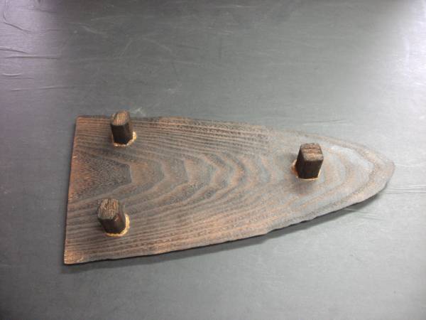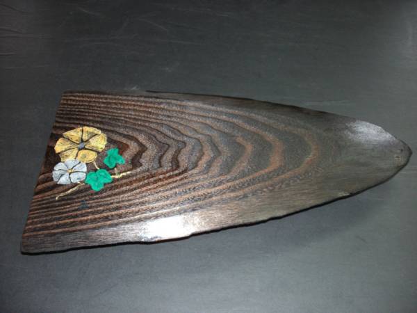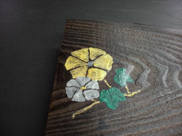 桐の一枚板を焼いて木目を浮き上がらせ、飾り台を作りました。材料の一枚板の自然の形を生かして飾り台を作っています。そしてその黒い焼桐を背景として金銀朝顔を描き飾り台のワンポイントとしました。 サイズ:33cmx19cmx4cm この度は思いきった値段にしました。 |