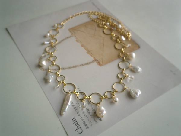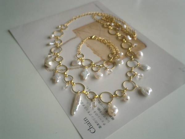 ロマンチックを集めて・・シリーズです♪やさしい白・・オフホワイトの淡水パールと水晶のネックレスとブレスレット2点セットです♪丸玉やハート、芥子パールやクロスなどデザイン違いのパールに水晶のランダムカットをデザインチェーンに繋いで可憐な表情です♪淡水パールは4ミリから23ミリ位までの大きさ違い、デザイン違い、水晶は4ミリと6ミリのランダムカットです♪長さはネックレスが全長70センチ位で調節自由です♪チョーカー風にされても可愛いです♪ブレスレットは全長23センチ位で調節自由です♪それぞれ単品でも出品しています♪♪シンプルで飽きのこないいつまでも着けられるデザインを考えて作りました♪ハンドメイドをご理解頂いてノークレーム、ノーリターンでお願いします