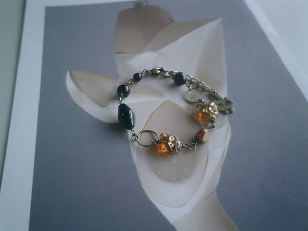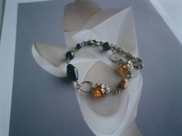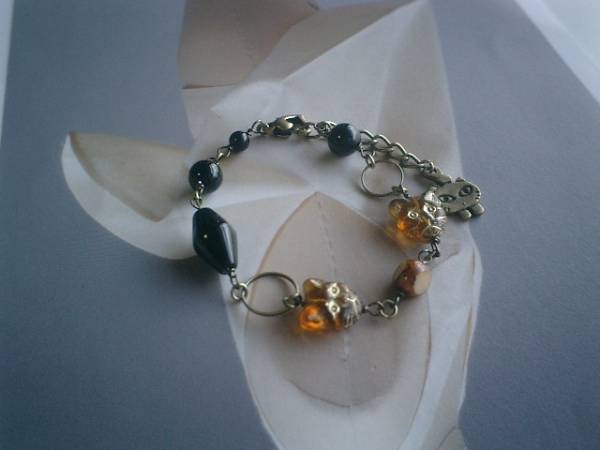 ロマンチック・パターンシリーズです♪都会の猫さん・・シックなオニキスのブレスレットです♪6ミリから15ミリ位までの丸玉やスクエアカットのオニキスに12ミリの琥珀色のチェコの猫さんやデザインビーズを合わせて大人のロマンチックしています♪長さは全長23センチ位で調節自由です♪♪お揃いのネックレスや同じシリーズも出品しています♪♪シンプルでいつまでも着けられるデザインを考えて作りました!ハンドメイドをご理解頂いてノークレーム、ノーリターンでお願いします