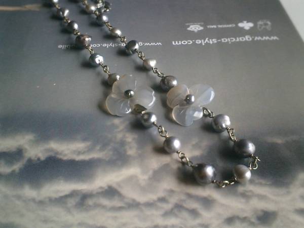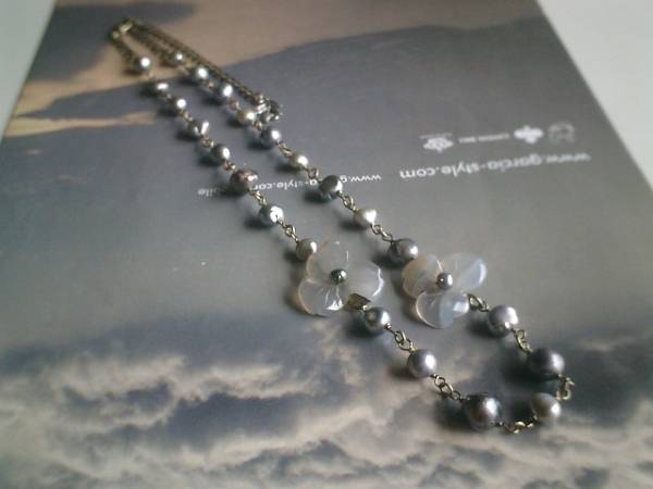 仏蘭西映画の余韻・・シリーズです♪♪淡水パールとお花・・シックな淡水パールのネックレスです♪グレーカルセドニーのお花を合わせて可憐な表情です♪淡水パールは7ミリから9ミリ位までのボタン、バロックなど大きさ違い、デザイン違いです♪カルセドニーのお花は22ミリ位です♪♪長さは全長60センチ位で調節自由です♪チョーカー風にされても素敵です♪長さ違いのネックレスやブレスレットも出品しています♪シンプルでいつまでも着けられるデザインを考えて作りました!♪♪ハンドメイドをご理解頂いてノークレーム、ノーリターンでお願いします
