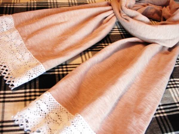 ピンク系 マイルドダスティーローズ くすみローズ とても細い糸で編まれた接結ガーゼニット コットン100% 薄くデリケートな編み地の2枚合わせ 片面はスラブ糸使用で控えめながらおしゃれな表情があります 素肌にやさしい柔らかな風合い ごわっと感、ちくっと感は全くございません。 素材を活かして筒縫いに。。。4重になりました。 表裏気にせず巻いていただけます♪ 両端には、幅広のゴージャスなトーションレースをこちらも筒状にぐるりとあしらって ナチュラルエレガントな印象に。。。 ソフトタイプのレースを用いました。 ◆サイズ (平置き:約cm) 幅:20 × 157(レース含む) 素材も色合いも優しくソフト、ナチュラルエレガントなストールをお求めの方に♪ 装いのアクセントにどうぞ。 気に入っていただけたら嬉しいです。 | ||||