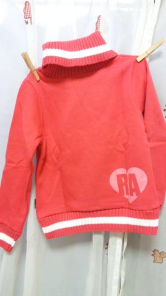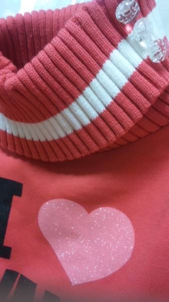 ◆リブ部ニットでネック部タートルが暖かい♪タートル部にはクリアーな飾りボタンが3っ♪前後ハート部はキラキララメプリント♪裏起毛付もあったか