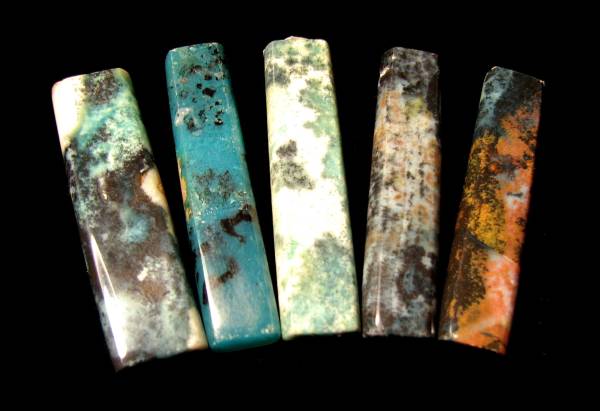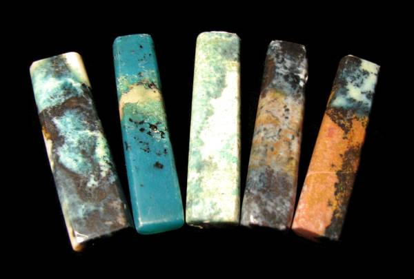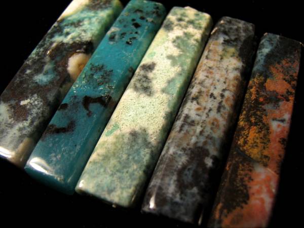 東部インドネシアのマルク諸島産出の緑玉髄製のアクセサリー用の加工品です。ペンダントヘッドなどに適しています。計5本セットです。サイズは長さが約5cm、幅は約1~1.3cm、厚みは約6~7mm。重さは5本でおおよそ46グラム。