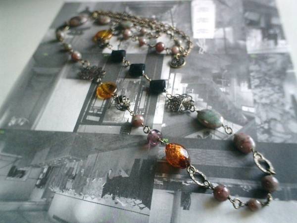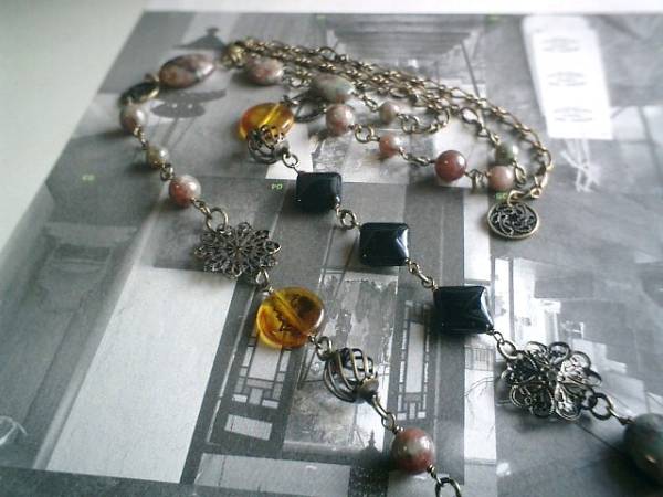 秋色・セレクション・・シリーズでス♪灰色の童話・・グリーンガーネットとオニキスのネックレスです♪アンティークビーズやデザインチャームを合わせて大人のロマンチックしています♪グリーンガーネットは6ミリ、8ミリの丸玉、10×14ミリ、13×18ミリのフラットオーバル、オニキスは11ミリのスクエアです♪10ミリから20ミリ位までのアンティークビーズや透かしチャームやデザインチャームを合わせました♪長さは全長102センチ位です♪2連にされても素敵です♪♪お揃いのブレスレットも出品しています♪シンプルで飽きのこないいつまでも着けられるデザインを考えて作りました!ハンドメイドをご理解頂いてノークレーム、ノーリターンでお願いします