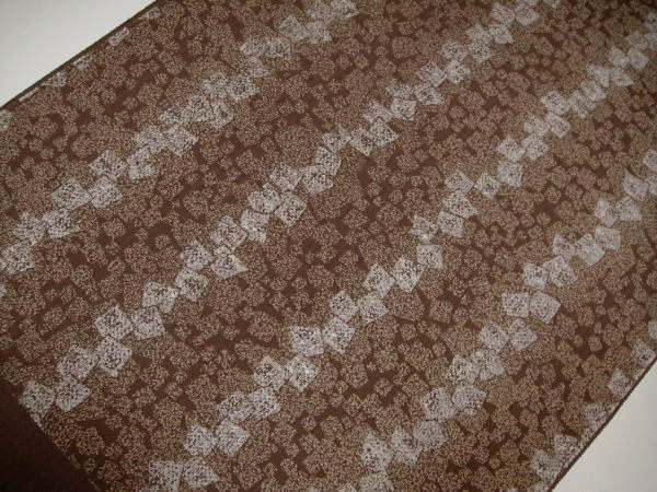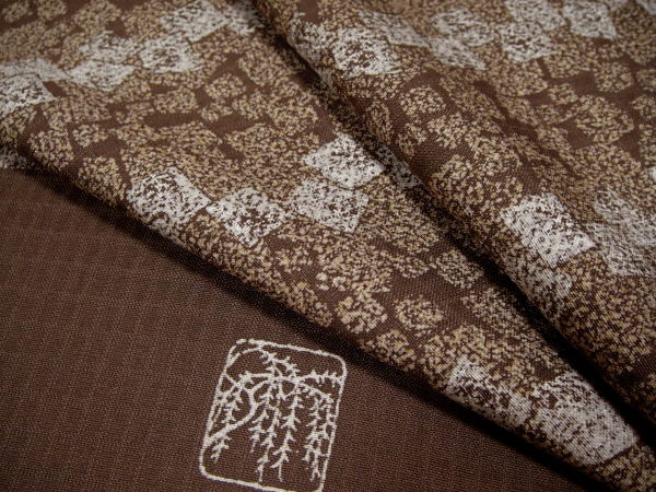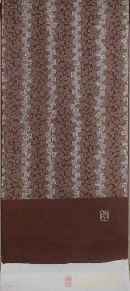 小豆茶色の地色に、色段落でタタキ柄の重なり合った色紙を縦に連ねるように染めた京友禅型染め小紋着尺です。