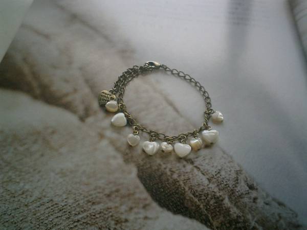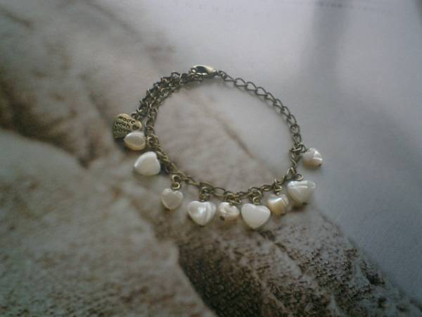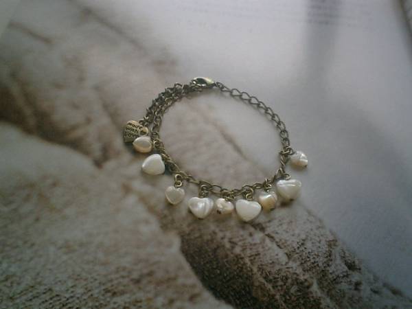 薔薇の香りの女の子・・シリーズです♪オフホワイトのマザーオブパールのブレスレットです♪♪7ミリ、9ミリの大きさ違いのハートのマザーオブパールはランダムに繋いでキュートな表情です♪長さは全長23センチ位で調節自由です♪♪お揃いのネックレスやイヤリングも出品しています♪♪シンプルで長く着けていただけるデザインを考えて作りました♪ハンドメイドをご理解頂いてノークレーム、ノーリターンでお願いします