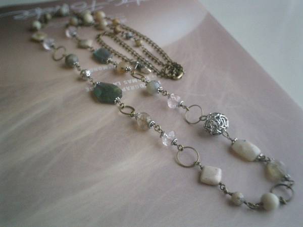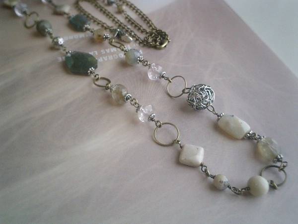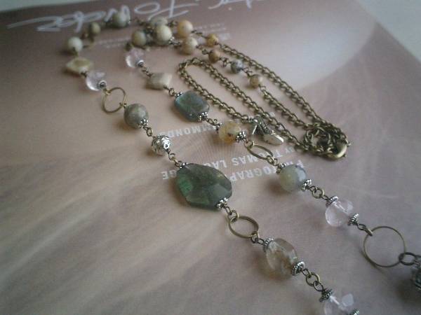 私的・乙女心・・シリーズです♪繊細なラブラドライトとアフリカンオパールのネックレスです♪神秘的なラブラドライトは10ミリのラウンドカットや10×14ミリのスクエア、22×17ミリ位のラフカットです♪10ミリのボタンカットのローズクォーツやラフカットのルチルクォーツや丸玉やスクエア、レグタングルなどデザイン違いのアフリカンオパールにデザインチャームを合わせて大人のロマンチックしています♪長さは全長107センチ位で調節自由です♪2連にされても素敵です♪♪お揃いのブレスレットも出品しています♪シンプルでいつまでも着けられるデザインを考えて作りました!ハンドメイドをご理解頂いてノークレーム、ノーリターンでお願いします