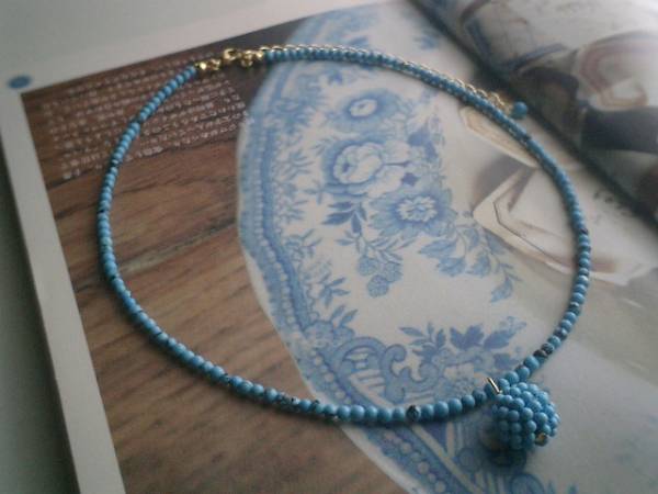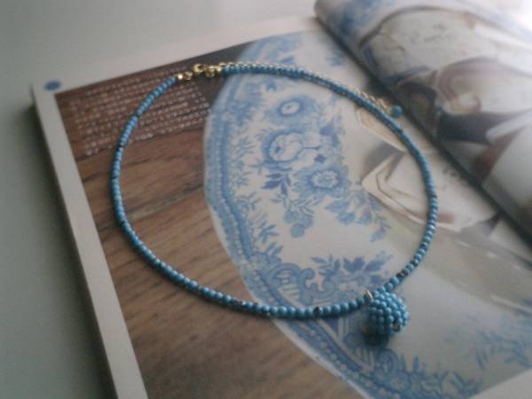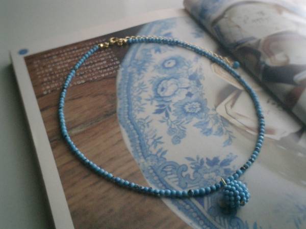 ジゼルの季節・・シリーズです♪ナチュラルデニムの香り・・キュートなトルコ石のネックレスです♪繊細な3ミリの丸玉のターコイズにトップはドイツ製のトルコ石(練り)の12ミリ位の編みボールを合わせてキュートな表情です♪長さは39センチ+アジャスター11センチで最長50センチ位です♪トップの編みボールは動かせますのでシンプルなデザインでも楽しんでいただけます♪お揃いのネックレスやブレスレットやピアスも出品しています♪シンプルで飽きのこないいつまでも着けられるデザインを考えて作りました♪ハンドメイドをご理解頂いてノークレーム、ノーリターンでお願いします