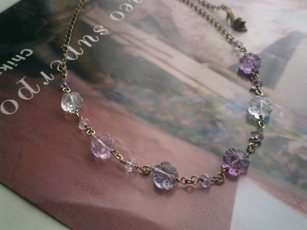 ベーシック・スタイル・・シリーズです♪花の妖精・・ロマンチックなフローライトとアメジストのネックレスです♪6ミリのボタンカットのアメジストに10ミリ位のお花のフローライトを合わせました♪繊細なお色が可憐な表情です♪お揃いのネックレスやブレスレットも出品しています♪シンプルで飽きのこないいつまでも着けられるデザインを考えて作りました!ハンドメイドをご理解頂いてノークレーム、ノーリターンでお願いします