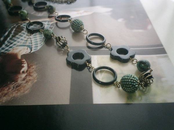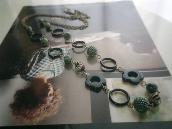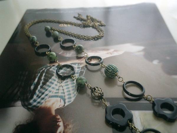 アンニュイ気分で・・シリーズです♪キュートなターコイズとオニキスのネックレスです♪19ミリ位のリングや23ミリ位のフラワーのオニキスに8ミリ、10ミリのターコイズの丸玉やビーズ玉を合わせてアンティークモダンなデザインです♪長さは88センチ位で調節自由です♪2連にされても可愛いです♪♪お揃いのブレスレットも出品しています♪シンプルで飽きのこないいつまでも着けられるデザインを考えて作りました!ハンドメイドをご理解頂いてノークレーム、ノーリターンでお願いします