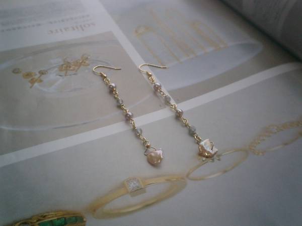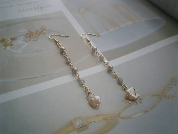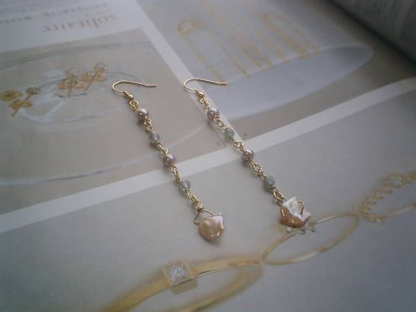 ベーシック・スタイル・・シリーズです♪儚い夢・・淡水パールとラブラドライトのロマンチックなピアスです♪ベージュピンクの5ミリ位のポテトの淡水パールに4ミリの丸玉のラブラドライトを合わせました♪トップは10ミリ位の花びらのような芥子パールです♪長さは全長9センチ位です♪イヤリングにも変更出来ます♪♪お揃いのネックレスやブレスレットも出品しています♪♪シンプルで飽きのこないいつまでも着けられるデザインを考えて作りました!ハンドメイドをご理解頂いてノークレーム、ノーリターンでお願いします