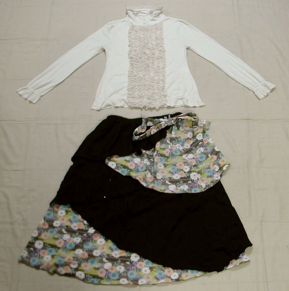 ■美品:ベージュ系ハイネックと黒地に花柄スカート? M    DmN95