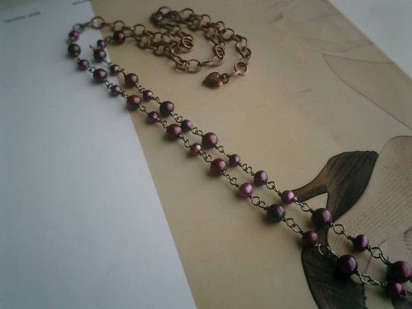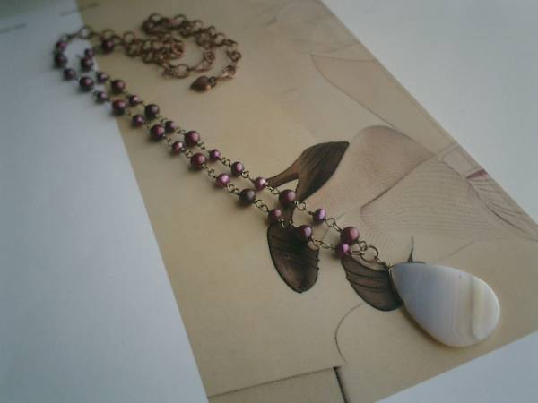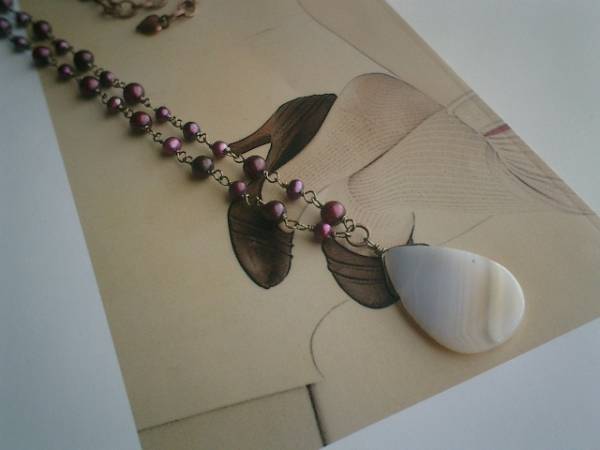 シベールのこだわり・・シリーズです♪パールで始まる物語Ⅳ・・シックなボルドー色のパールとグレーカルセドニーのネックレスです♪ダークボルドー色の淡水パールは4ミリと6ミリ位のポテトです♪30×22ミリ位のフラットドロップのグレーカルセドニーを合わせてさりげなく華やかな表情です♪長さは全長72センチ位で調節自由です♪お揃いのブレスレットやイヤリングも出品しています♪シンプルで飽きのこないいつまでも着けられるデザインを考えて作りました♪ハンドメイドをご理解頂いてノークレーム、ノーリターンでお願いします