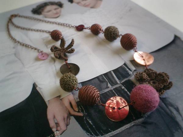 形のない夢を捉えて!シリーズです♪秋の色に染まって!フェルト玉や編みボールやシェルボタンのキュートなネックレスです♪深いシックなブラウンやモーヴピンクや煉瓦色を集めて可憐にまとめました♪フェルト玉は25ミリくらい、編みボールは15ミリ位、サテンボールは12ミリから15ミリ位の大きさ違い、編みフラワーは36ミリ位、シェルボタンは12ミリと20ミリの大きさ違いです♪シックなお色でまとめてキュートに大人のロマンチックしています♪長さは全長70センチ位で調節自由です♪秋のお洋服に合わせて楽しんでいただきたいです♪お揃いのブレスレットや同じシリーズも出品しています♪シンプルで飽きのこないいつまでも着けられるデザインを考えて作りました!ハンドメイドをご理解頂いてノークレーム、ノーリターンでお願いします