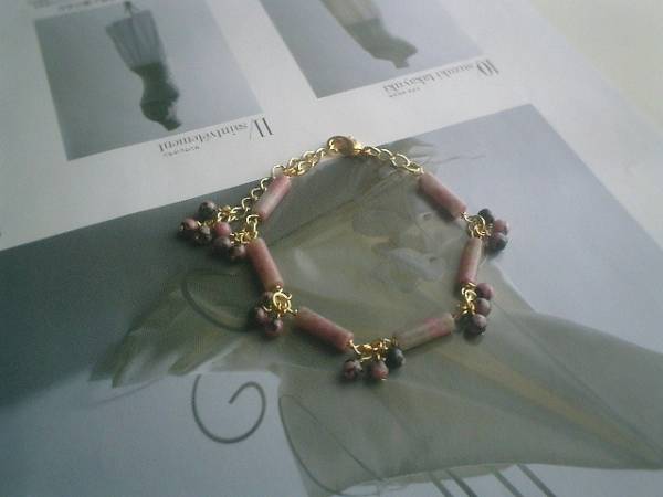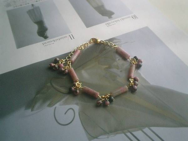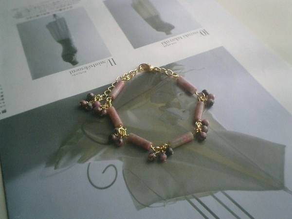 秋のヒロイン・・シリーズです♪モンロー気分で・・キュートなロードナイトのブレスレットです♪シックなダークピンクに黒やホワイトが混在したアートなアフリカンロードナイトは4ミリの丸玉と12×5ミリ位のチューブ型です♪ランダムに繋いで可憐な表情です♪長さは全長23センチ位で調節自由です♪お揃いのネックレスやピアスも出品しています♪シンプルで飽きのこないいつまでも着けられるデザインを考えて作りました!ハンドメイドをご理解頂いてノークレーム、ノーリターンでお願いします