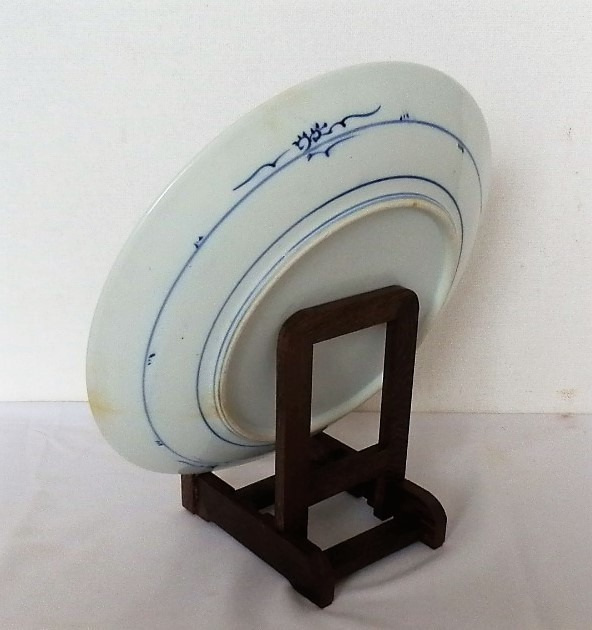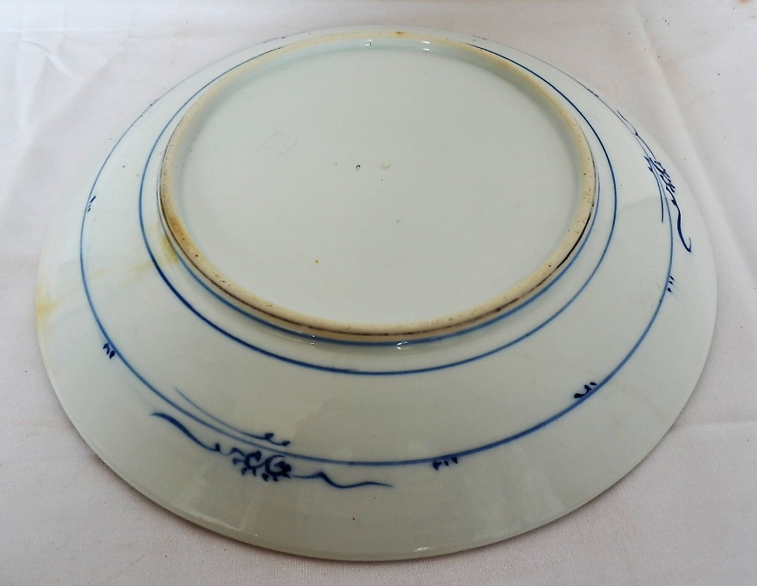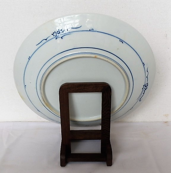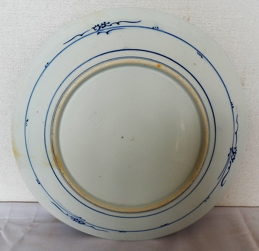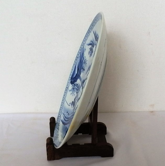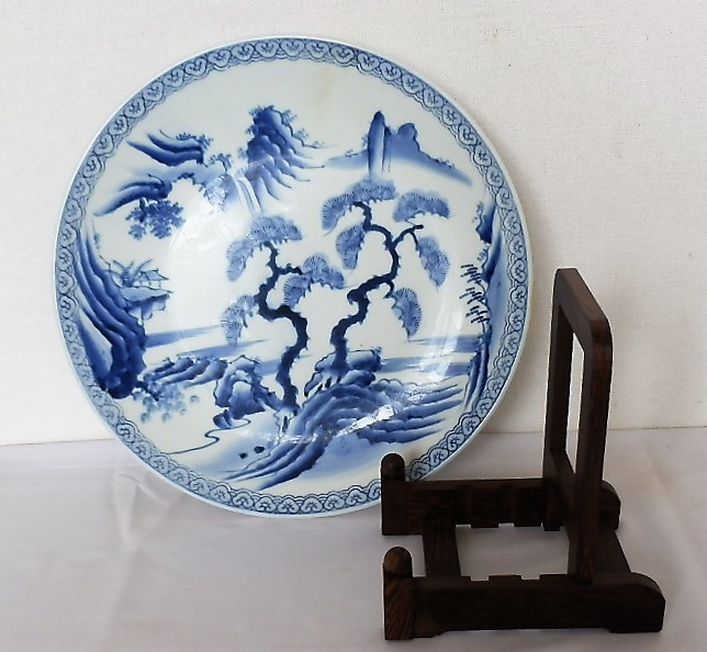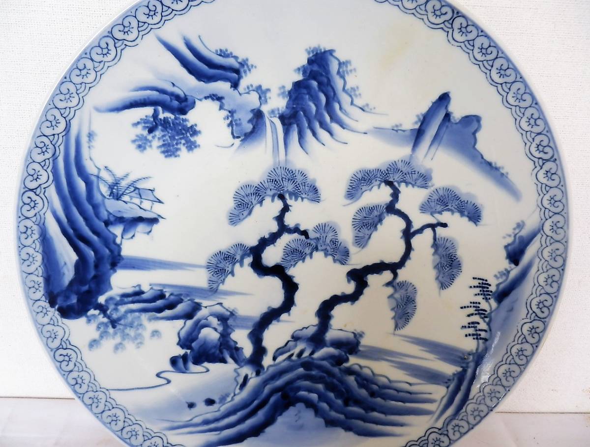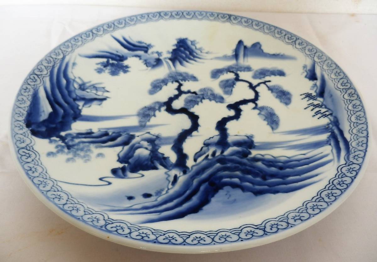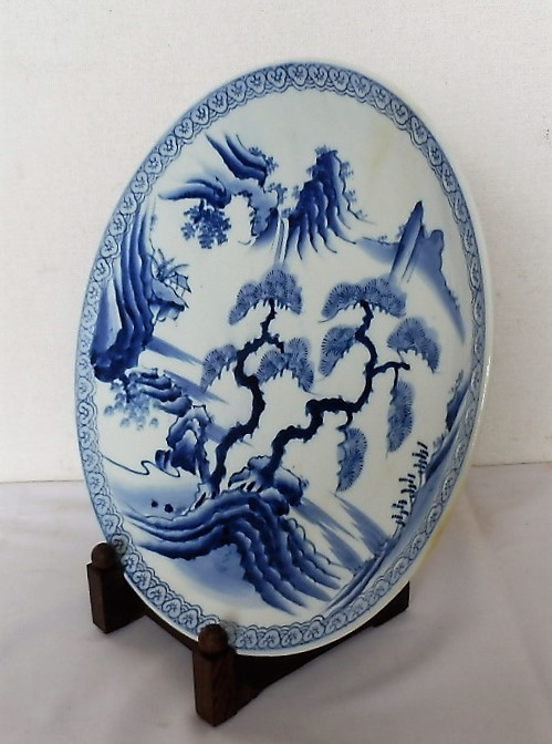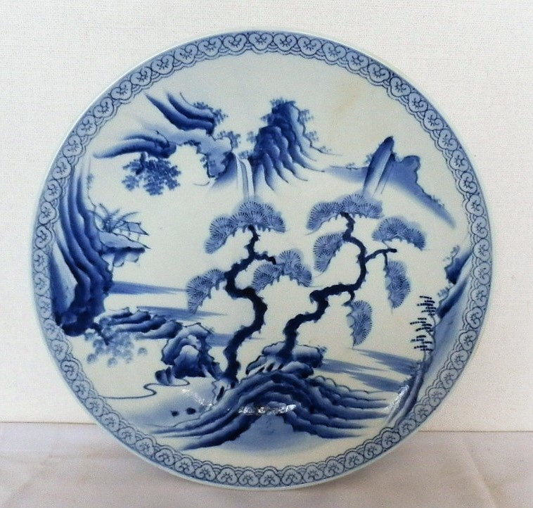 コメント:伊万里焼・染付手書き山水地紋のサーチ皿、1,1尺です。