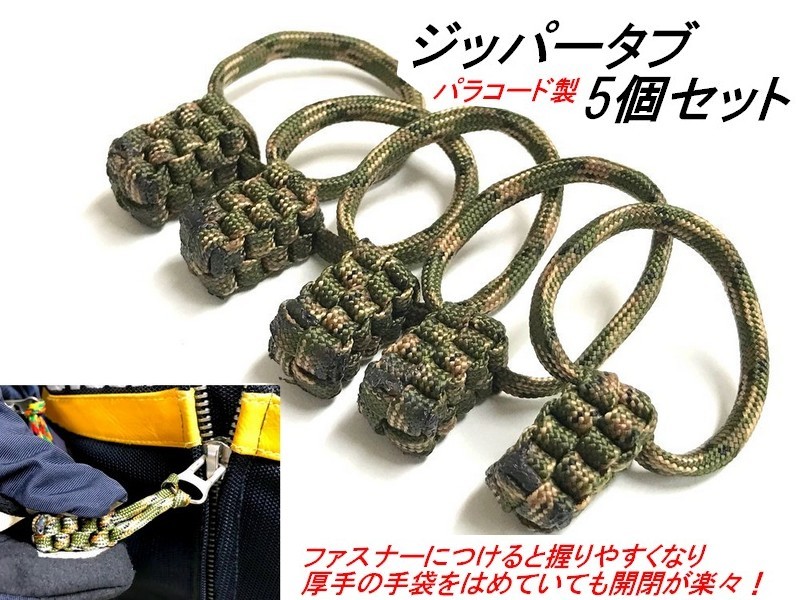 パラコード製 ジッパータブ【 カモGダーク 5個 】プルコード ジップタイ ジップタブ ファスナータグ 厚手グローブ装着中もファスナー楽々