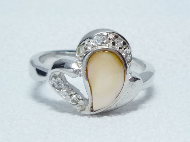 使用されているシェルはゴールドカラー系ですが白蝶貝で、仕上げも美しくハートモチーフでさりげに可愛いです♪シェル素材はどうしても自然のものなので、同じようなリングでも色合い雰囲気テリなどが違います。画像にて吟味してご検討ください。またどうしても古いお品なので、未使用品ではありますが経年感はややあると思います。