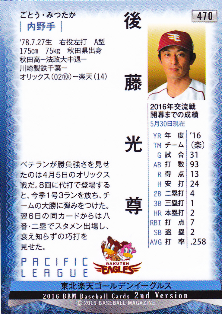 BBM2016ベースボールカード2nd 470 後藤光尊 秋田県 秋田高校 川崎製鉄千葉 オリックス・バファローズ 東北楽天ゴールデンイーグルス
